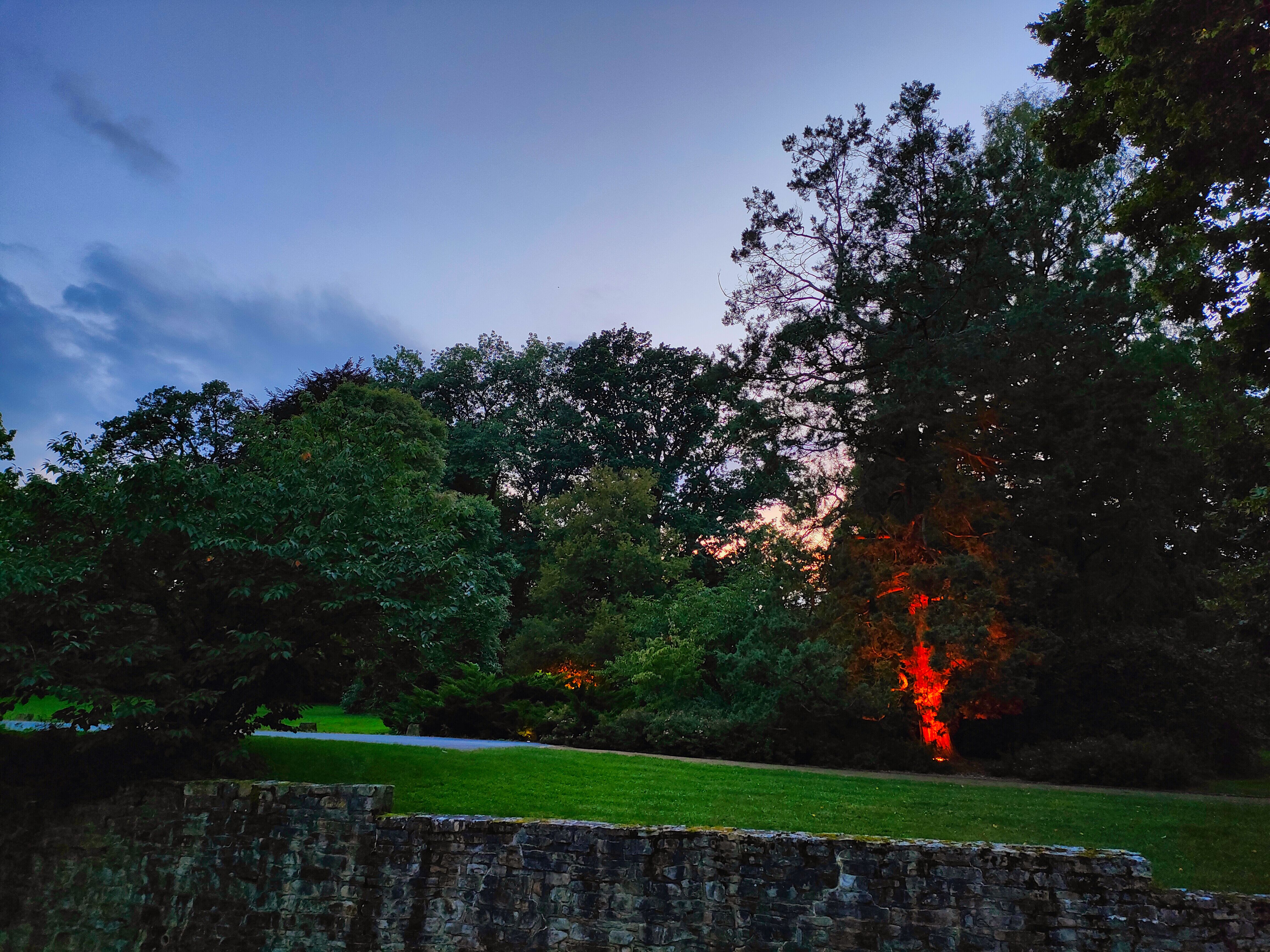 Schlosspark vom Schloss Schwöbber bei Abenddämmerung.