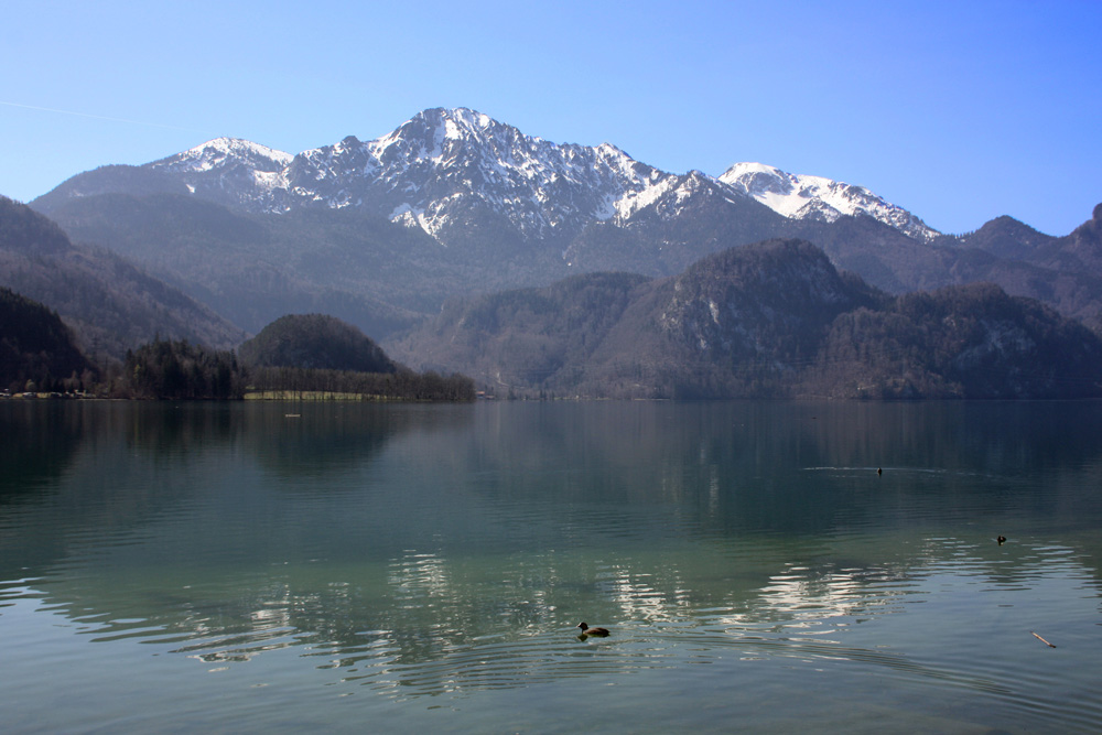 Der Kochelsee im März mit Blick auf die schneebedeckten Gipfel des Herzogstands und des Heimgartens.