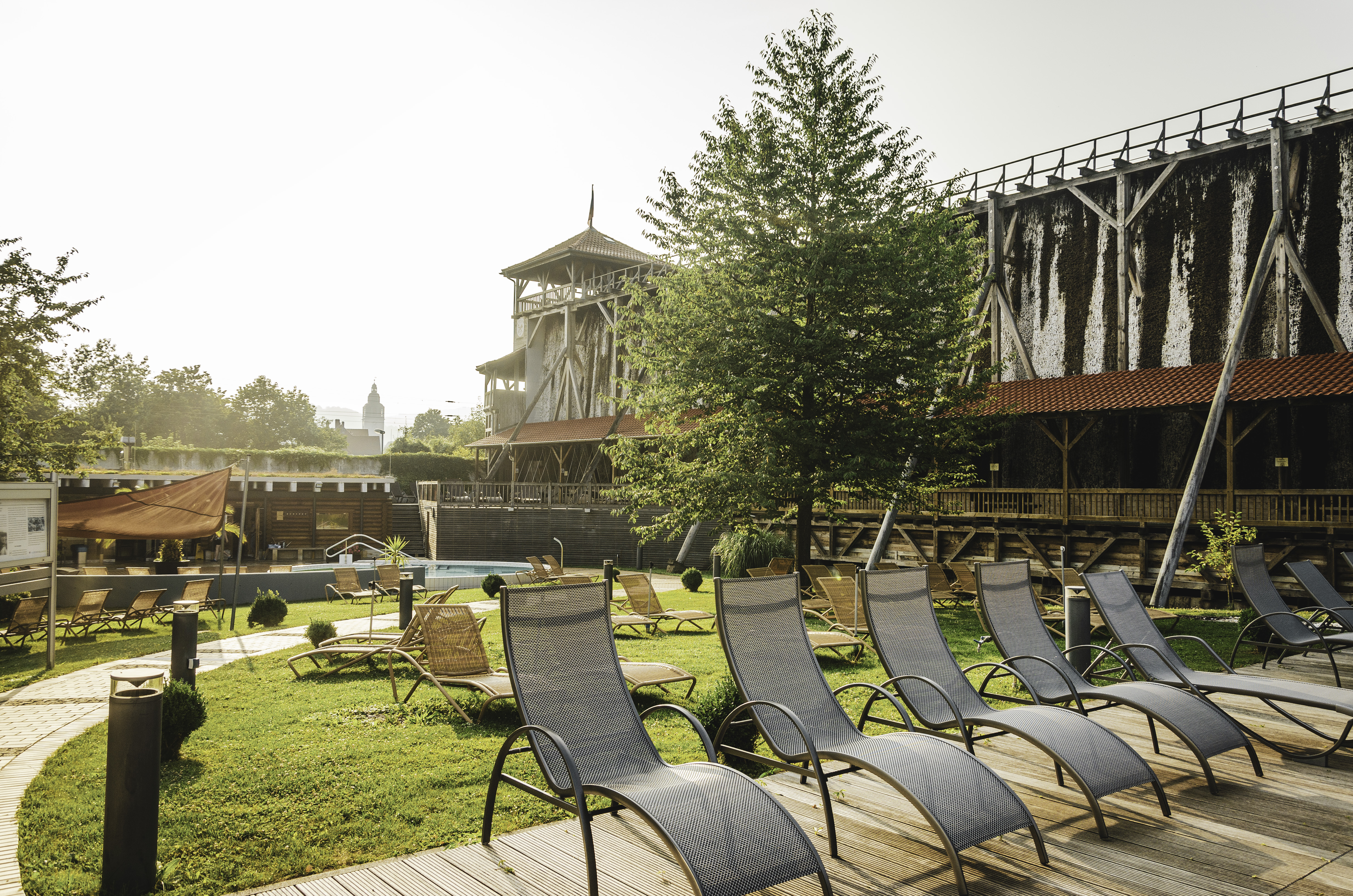 Hier das Außenbecken sowie Saunagarten mit integriertem Gradierwerk.