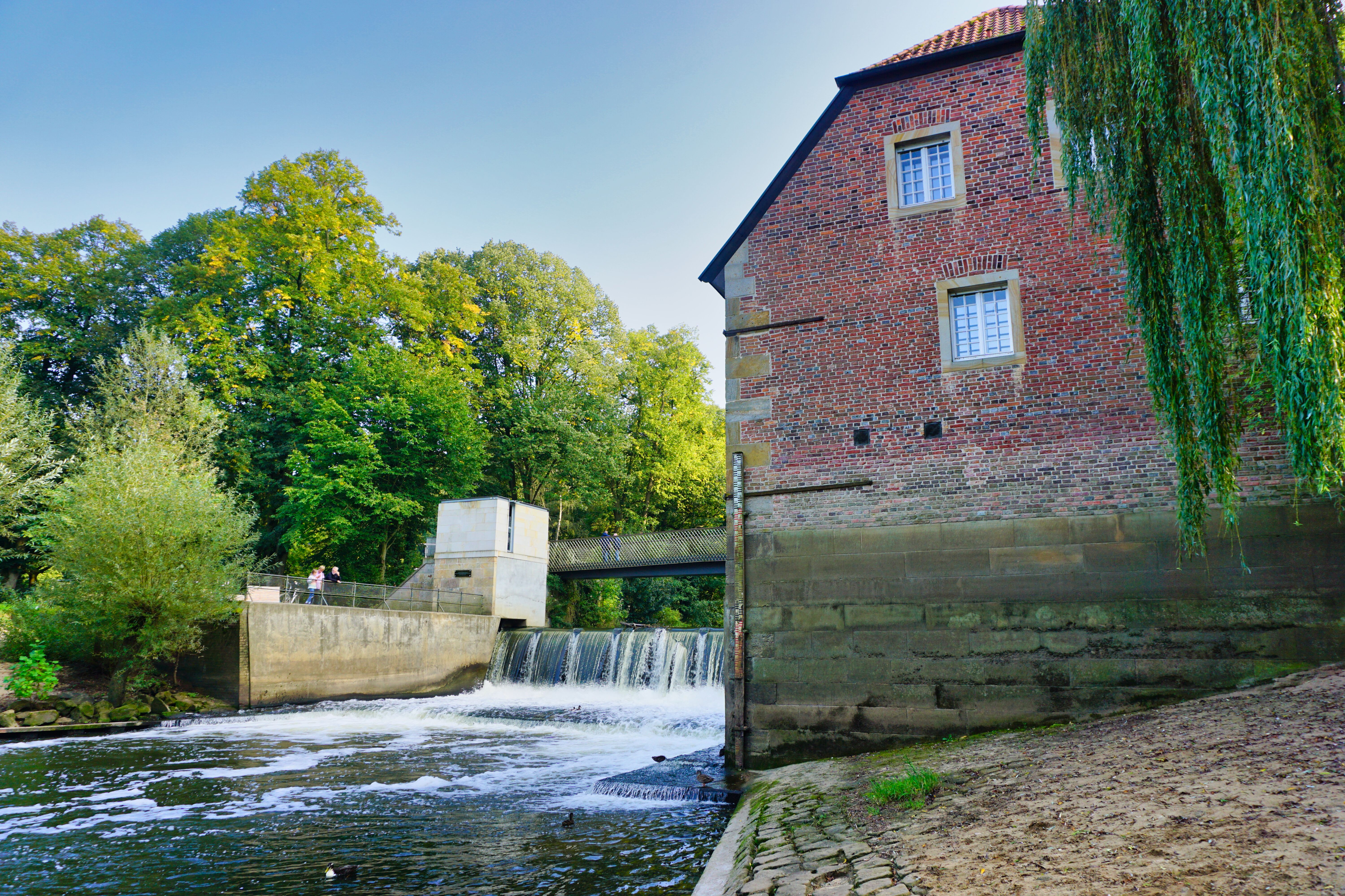 Das Christoph-Brensmeyer-Haus, auch bekannt als Große Mühle, mit der Emswehr in Telgte.