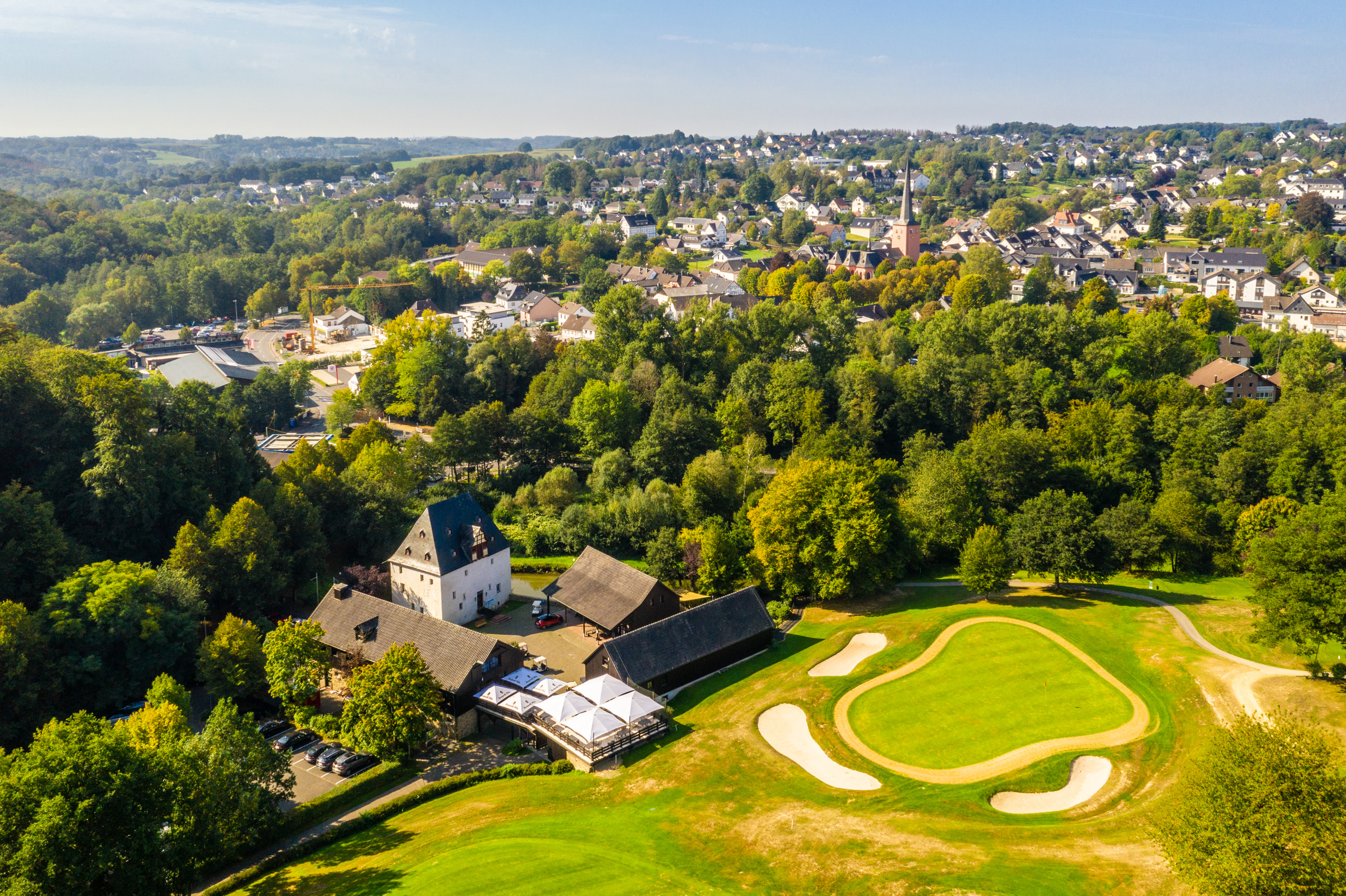 Luftbild von Burg Overbach bis nach Much-Zentrum.