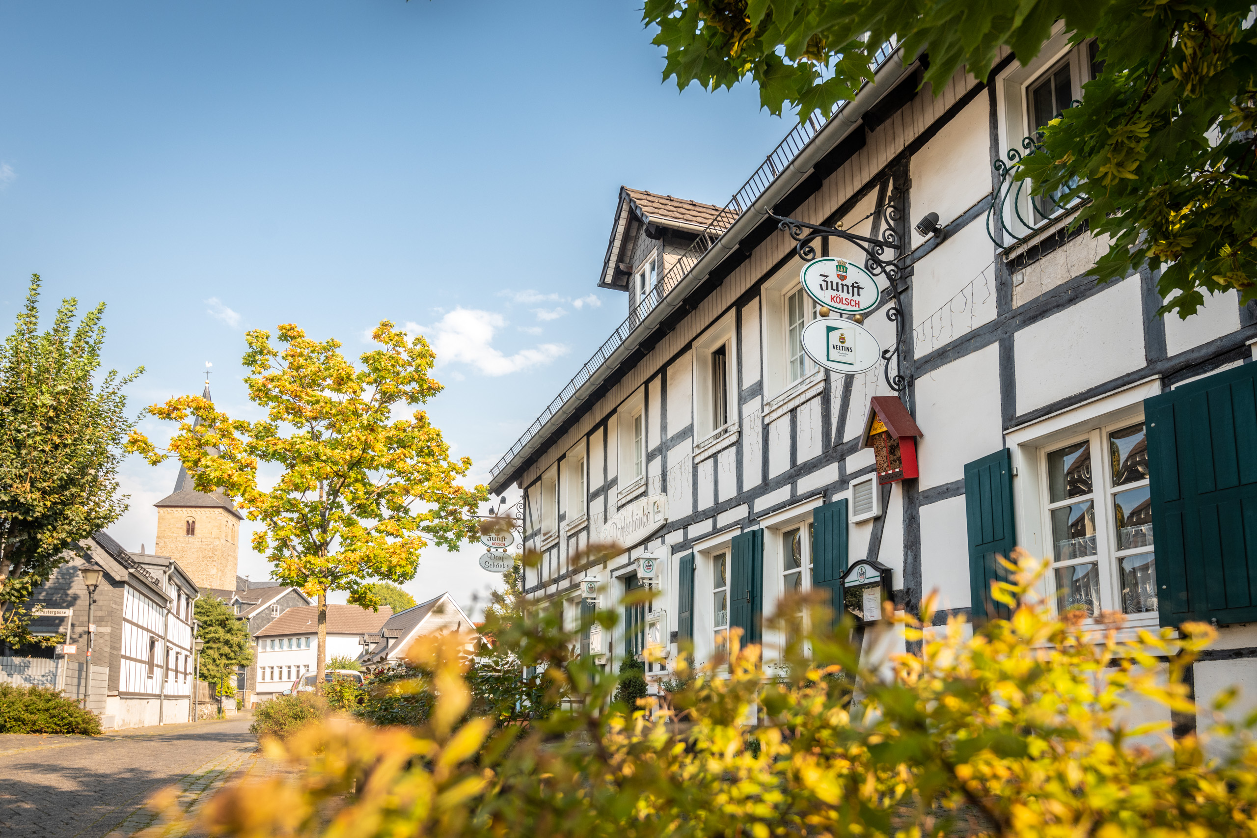 Fachwerkhäuser und eine Baumallee in einem idyllischen Dorf... Die Kirche im Hintergrund bei Sonnenschein.