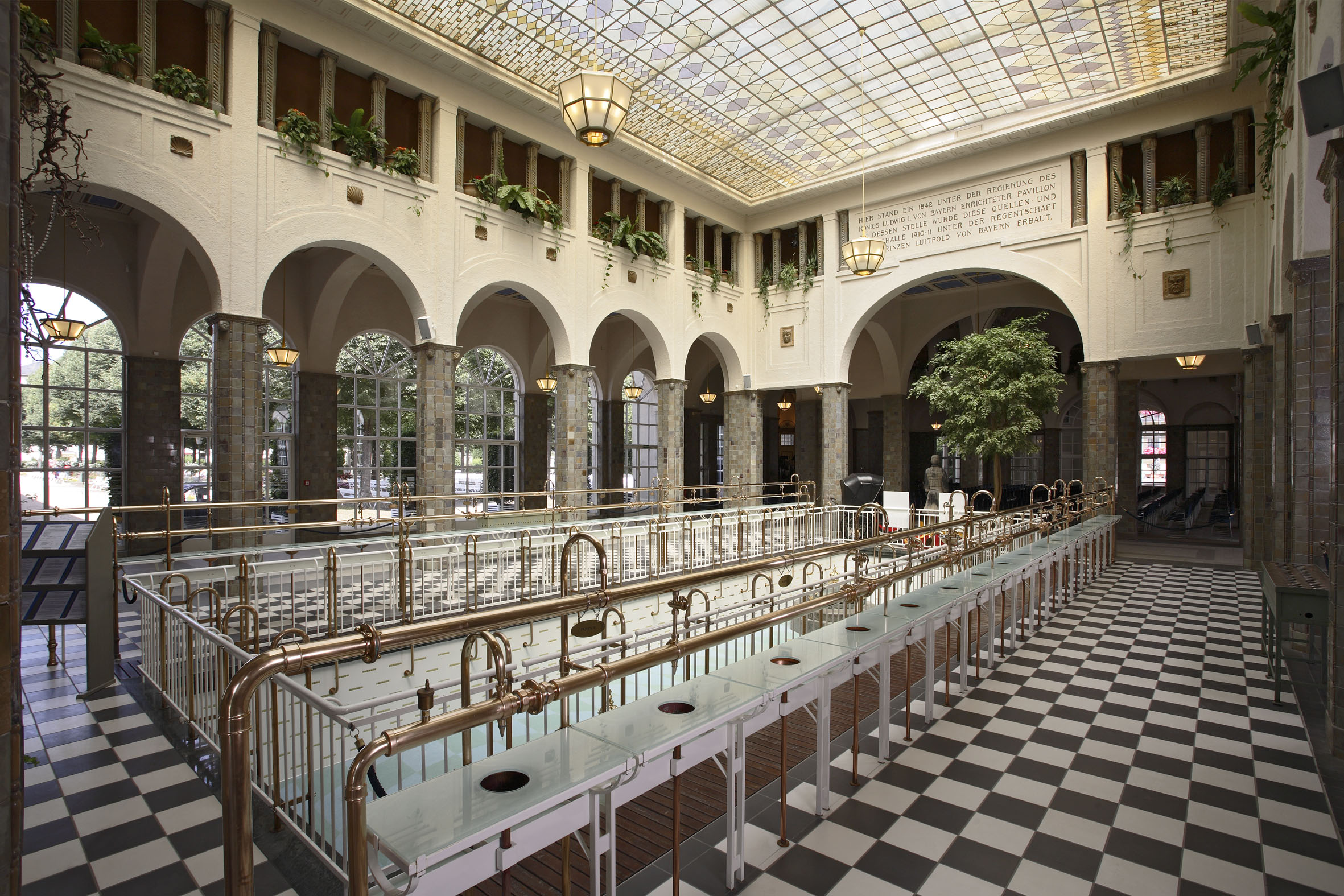 In der Brunnenhalle wird das Heilwasser in ein edel wirkendes Röhrenwerk aus Bronze geleitet.