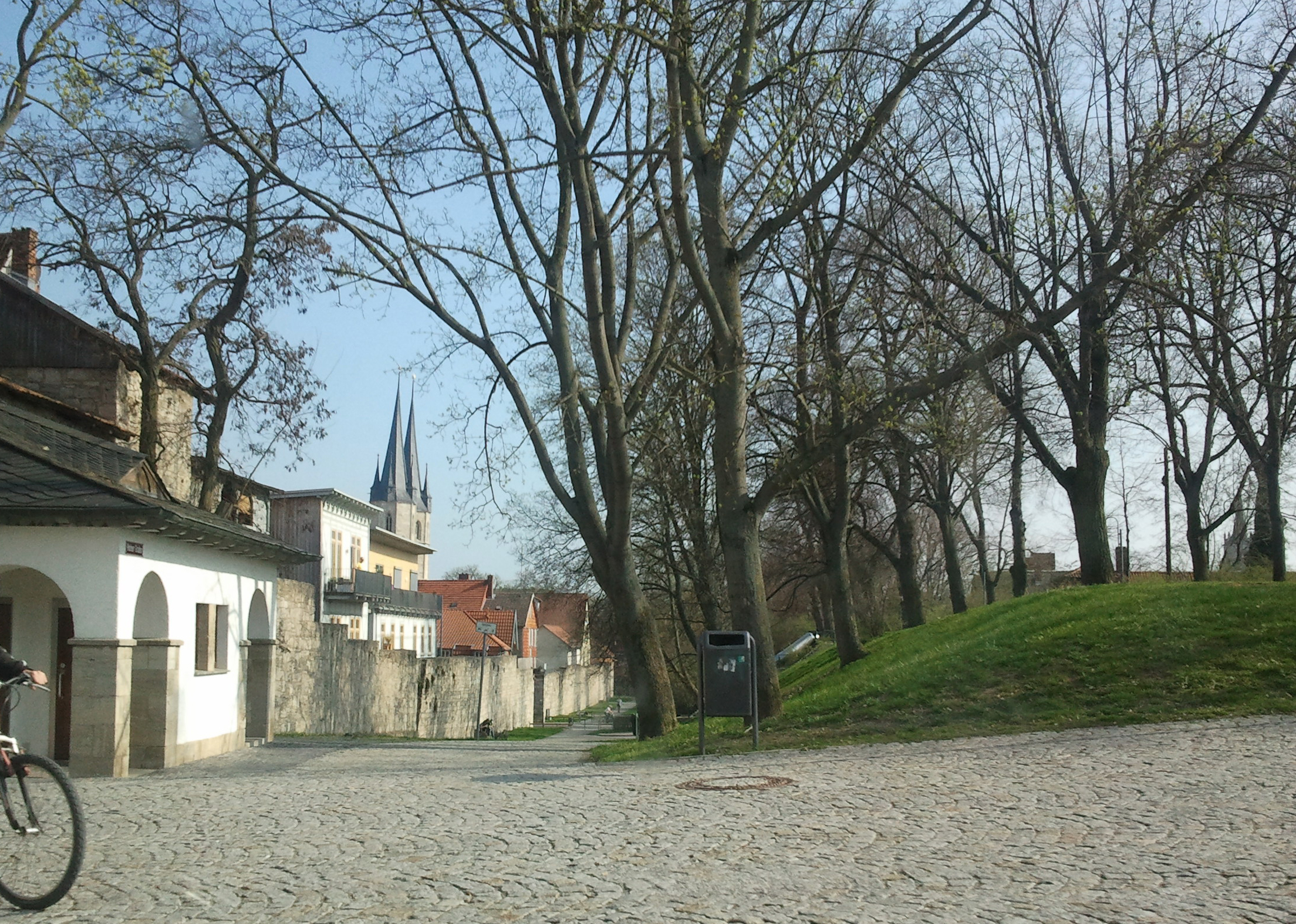"Hoher Graben" von Mühlhausen mit Spielplatz und die Jakobikirche im Hintergrund.