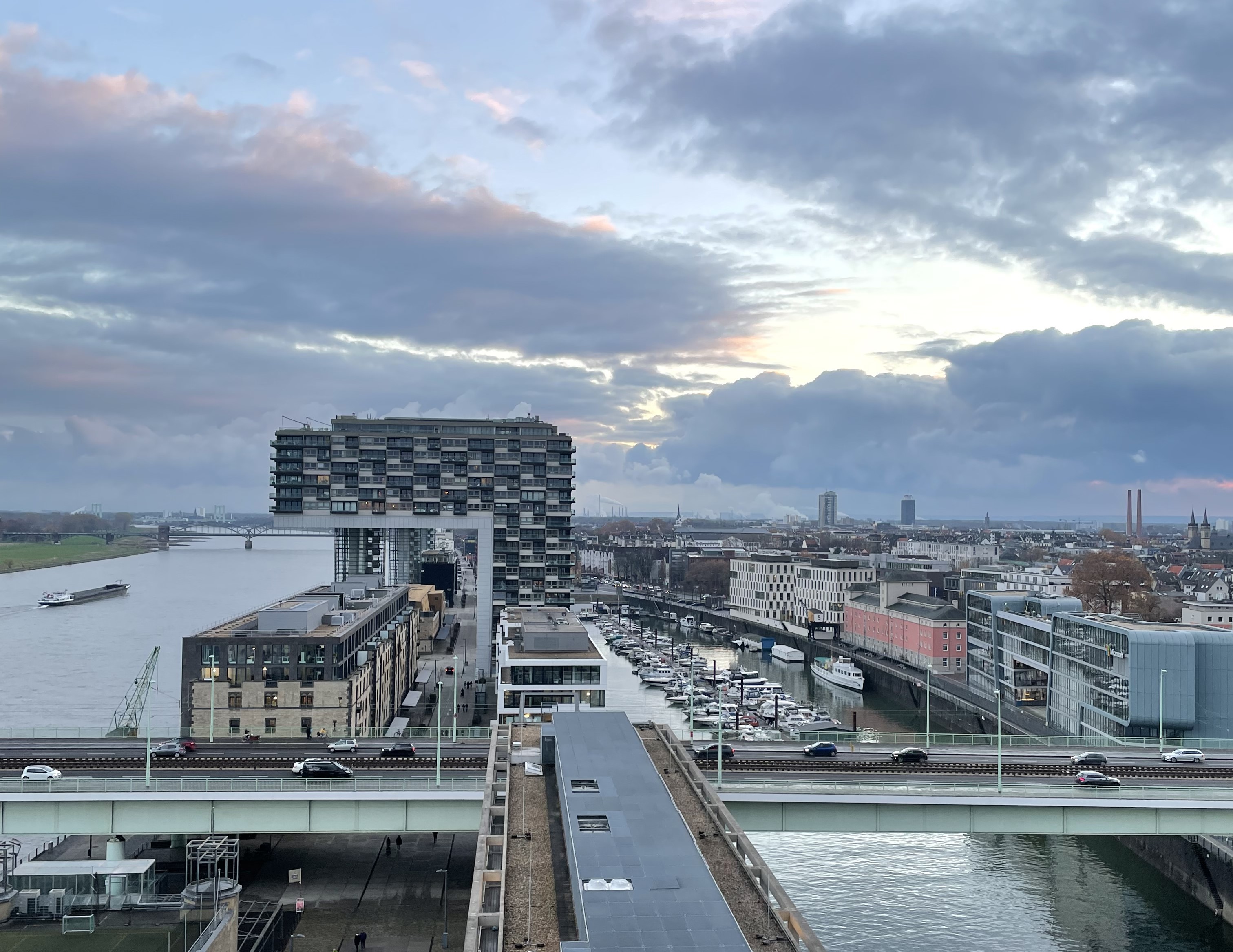 Blick über die Severinsbrücke und den Rheinauhafen von Köln.