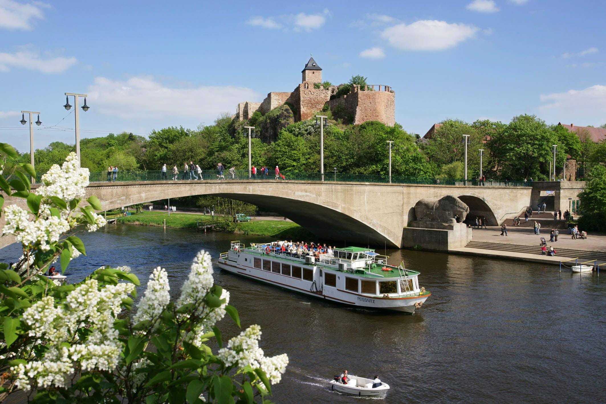 Der Torturm (12. Jhd.) bietet als Aussichtsturm einen einmaligen, unvergesslichen Blick über das Saaletal. Die Unterburg ist seit 1921 Sitz der heutigen Hochschule für Kunst und Design Halle - Burg Giebichenstein.