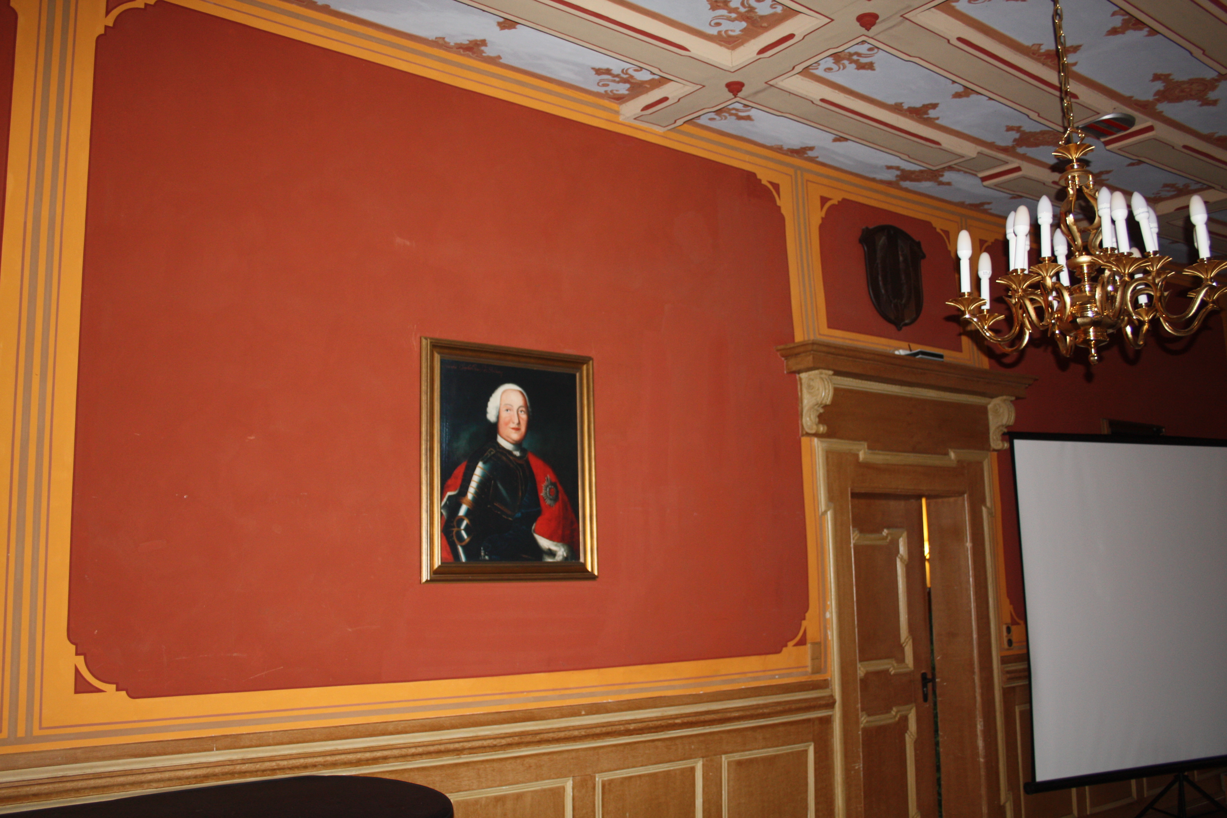 Besonders die eingelassenen Wappen in der Holzdecke machen den Wappensaal zu einem echten Schmucksaal.