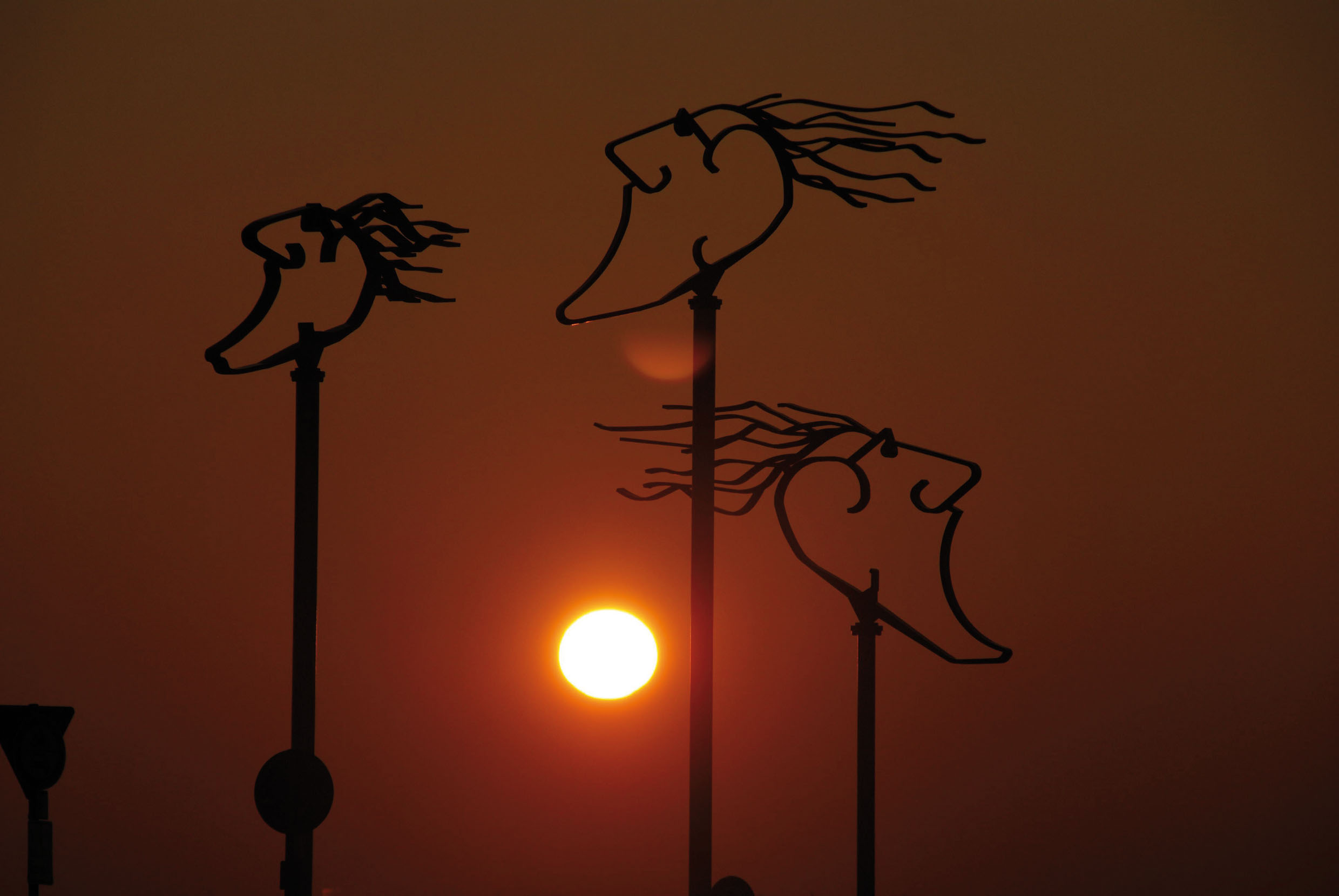 Sonnenuntergang am Sandstrand von Wilhelmshaven mit Kunstobjekten im Vordergrund.
