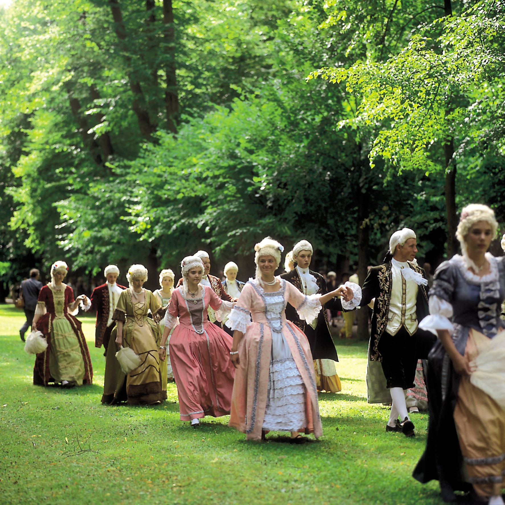Höfische Trachten des fränkischen Rokoko, Musik und Tanz des 17. und 18. Jahrhunderts vor der Kulisse der markgräflichen Orangerie im Hofgarten.