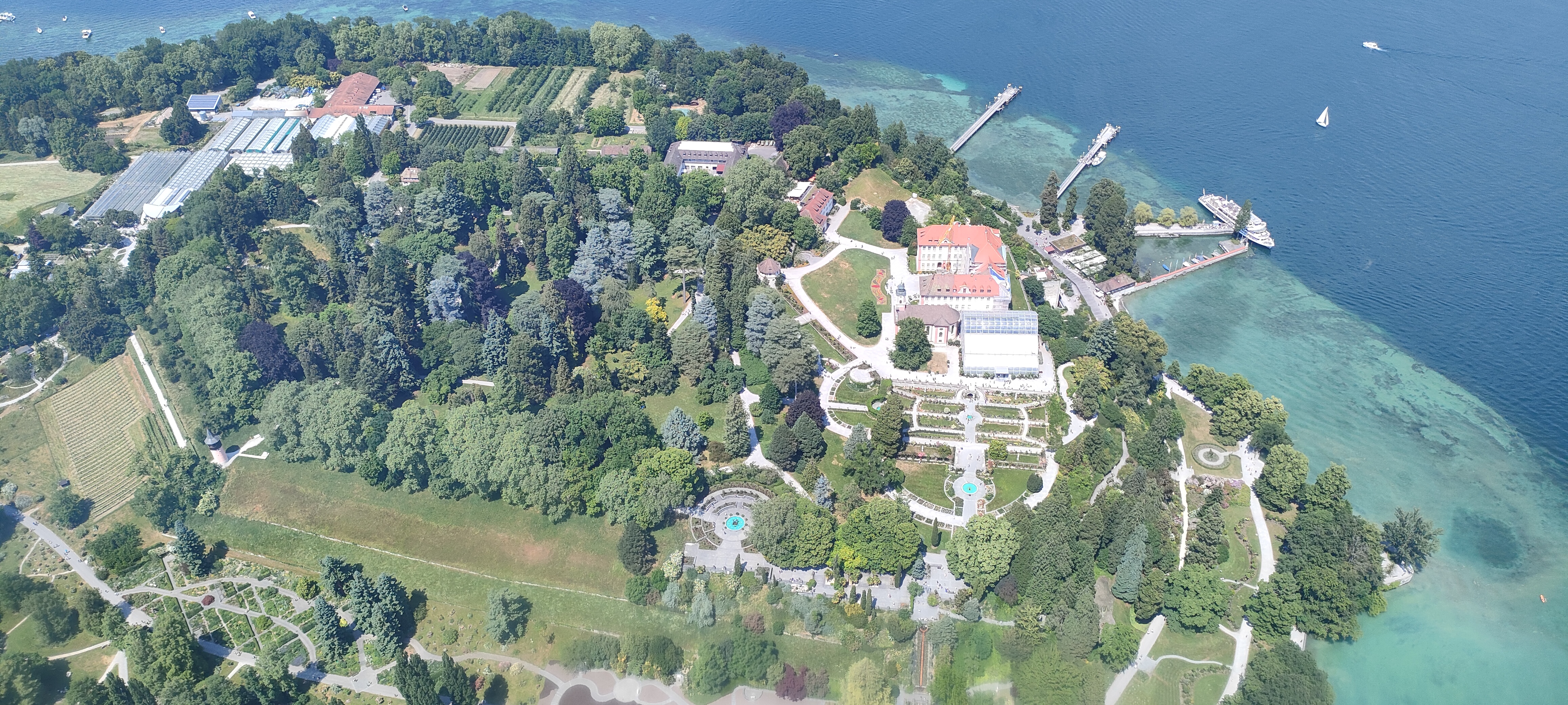 Die Insel Mainau mit ihrem Schloss aus der Luftansicht.