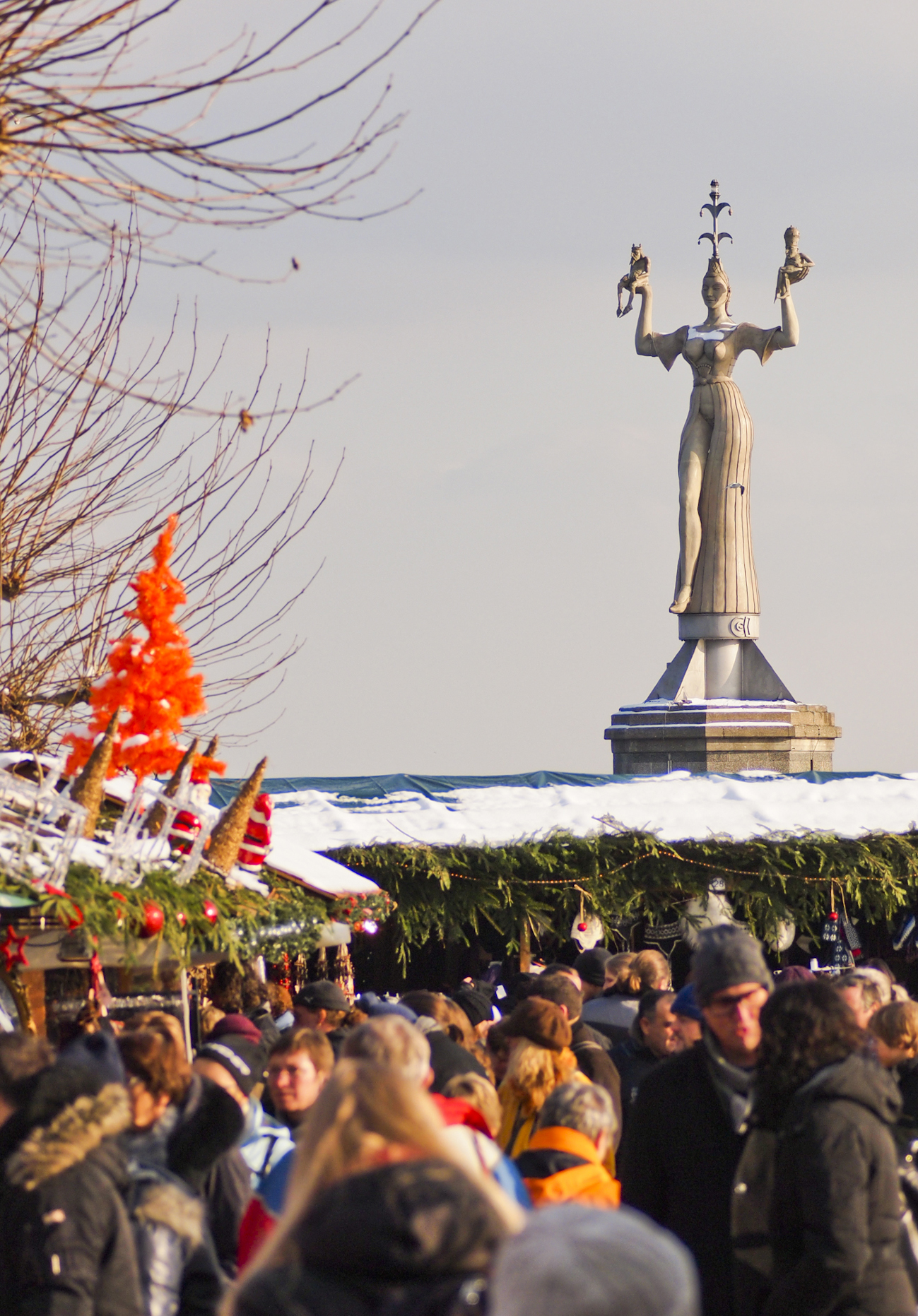 Die neun Meter hohe Statue der Imperia thront über dem bunten Weihnachtsmarkt-Treiben.