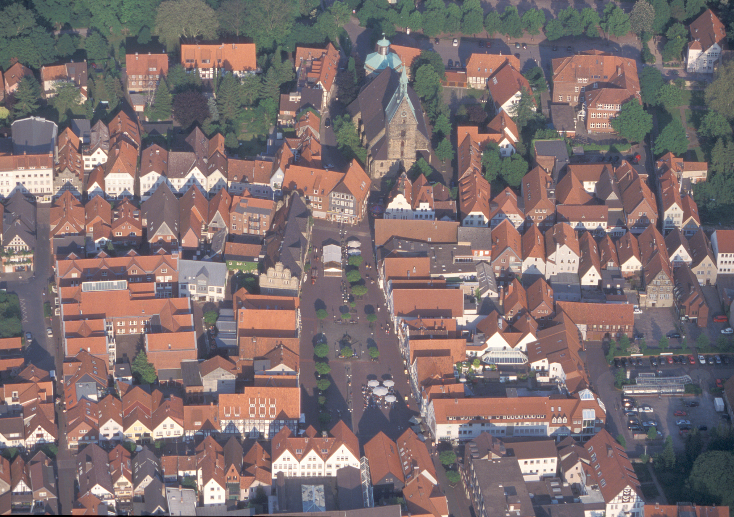 Luftaufnahme von Stadthagen mit dem sehenswerten Marktplatz und der St. Martini Kirche.