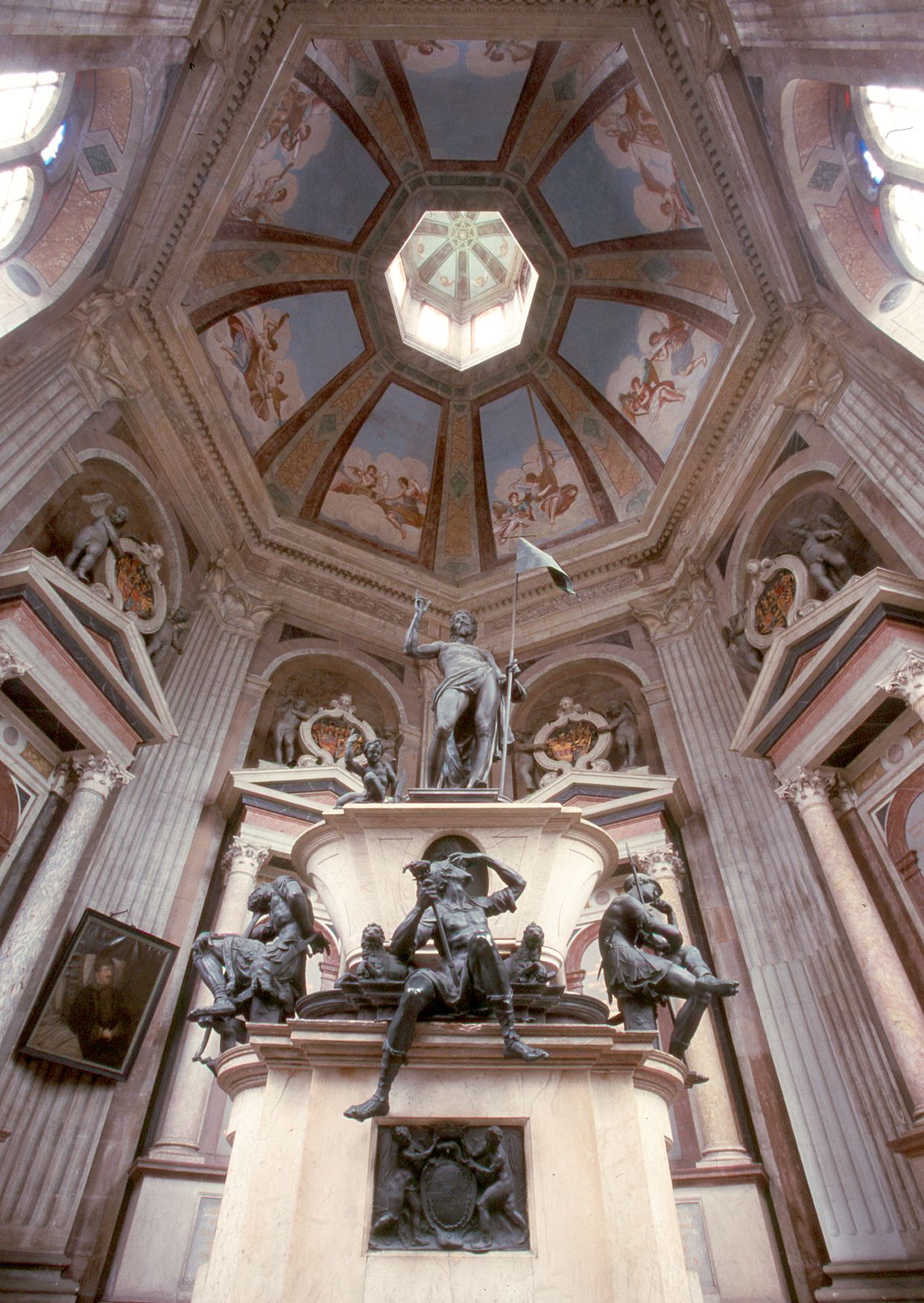Das Grab- und Auferstehungsmonument im Inneren stammt von von Adriaen de Vries. Die sieben Gewölbesegmente sind mit je zwei musizierenden Engeln ausgestattet und finden im gesamten Stil der italienischen Renaissance zum Gesamtbild des Fürstenmausoleums.