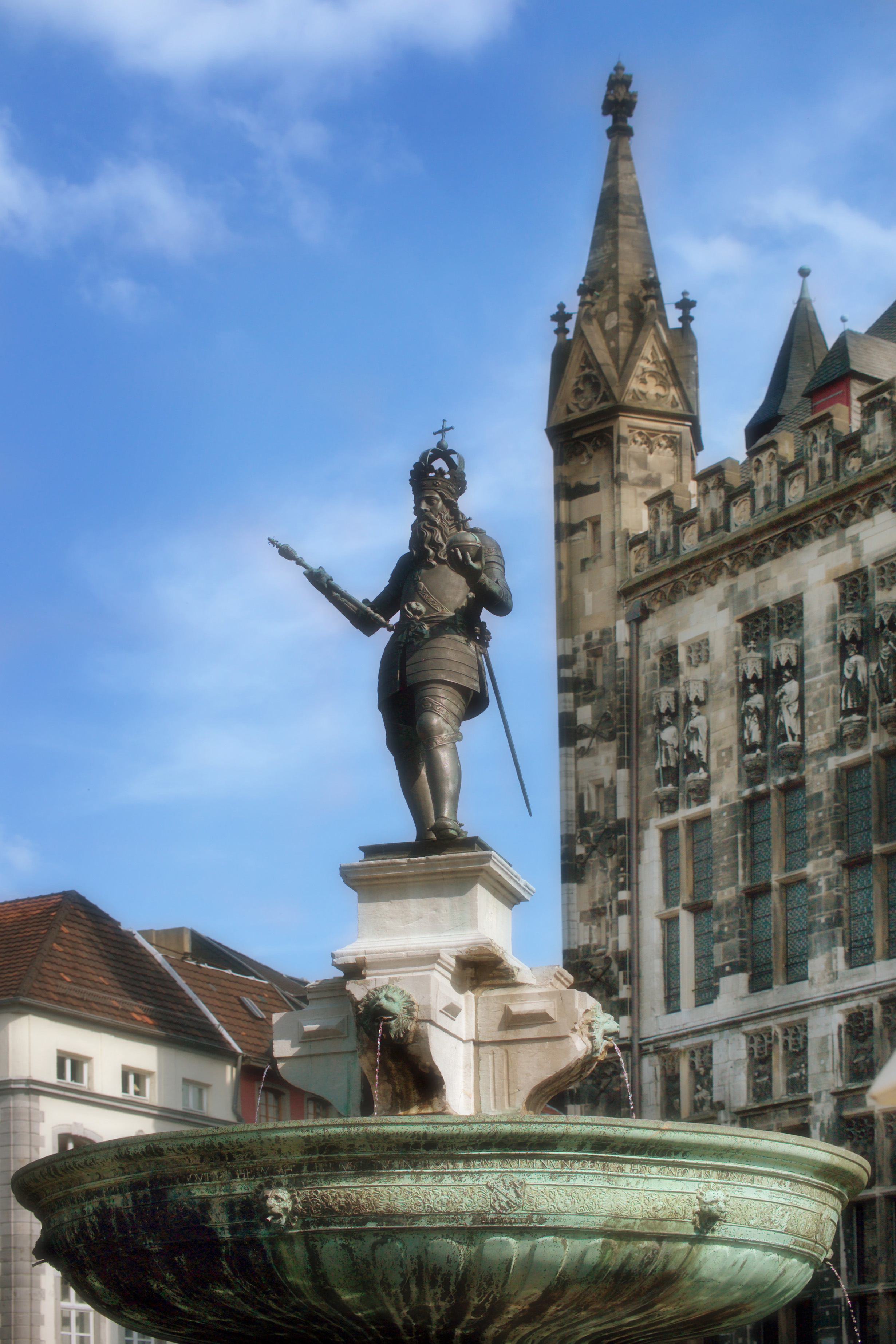 Der Karlsbrunnen (auch Marktbrunnen), der älteste Brunnen Aachens, steht direkt vor dem Aachener Rathaus. Seit 1620 krönte ihn die Figur Karls des Großen.