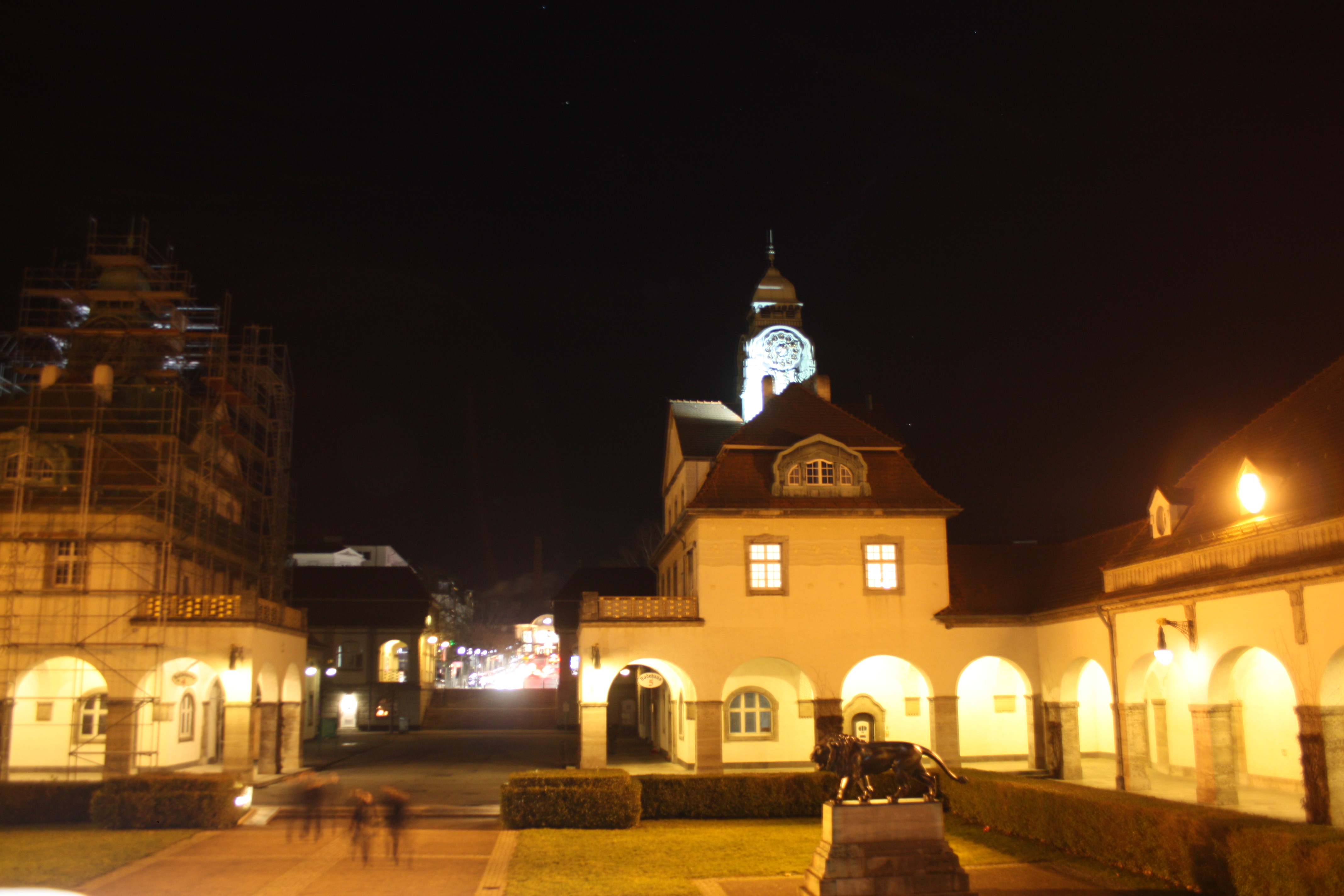 Der Sprudelhof von Bad Nauheim bei Nacht.