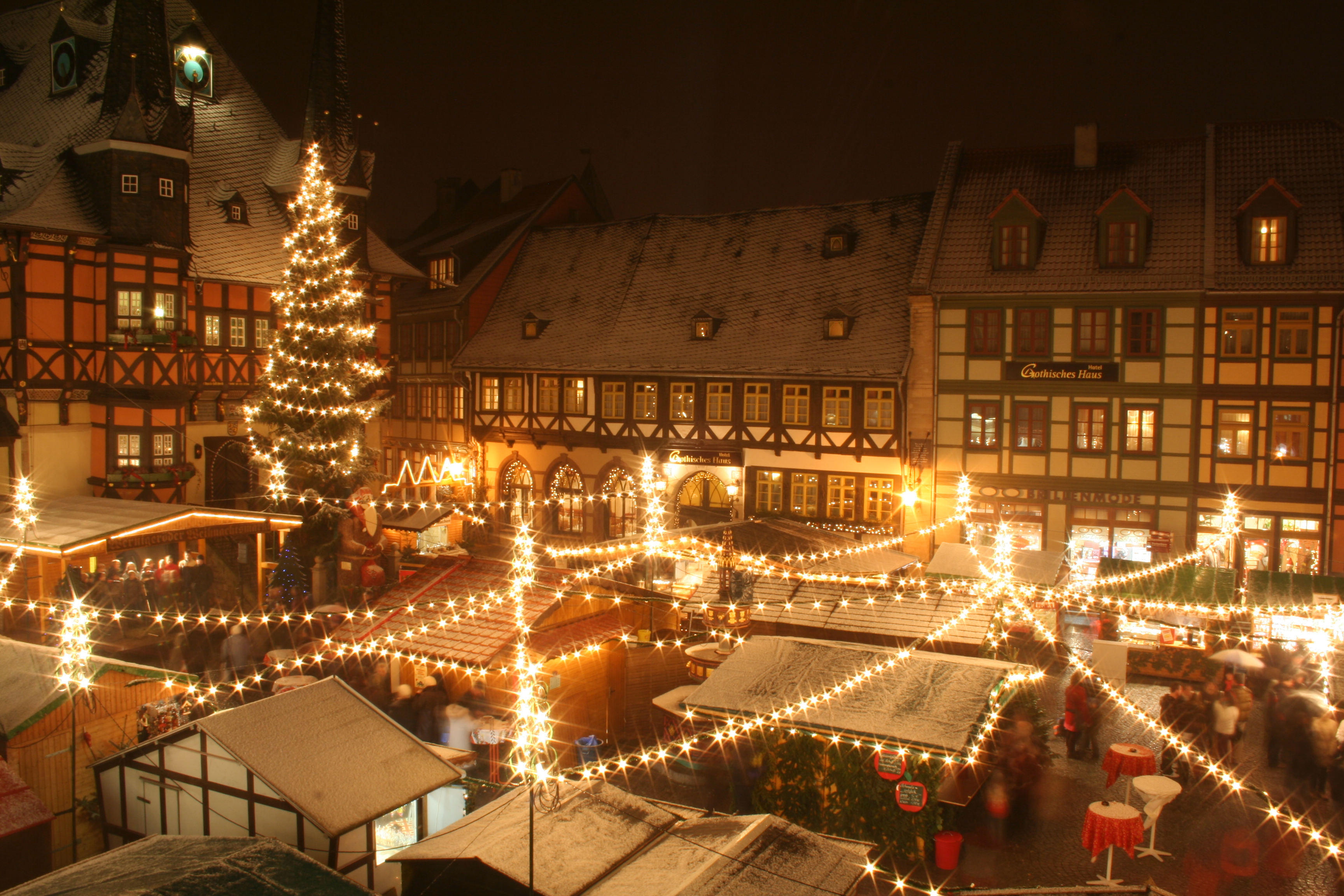 Der festlich geschmückte Weihnachtsmarkt in Wernigerode vor dem historischen Rathaus.