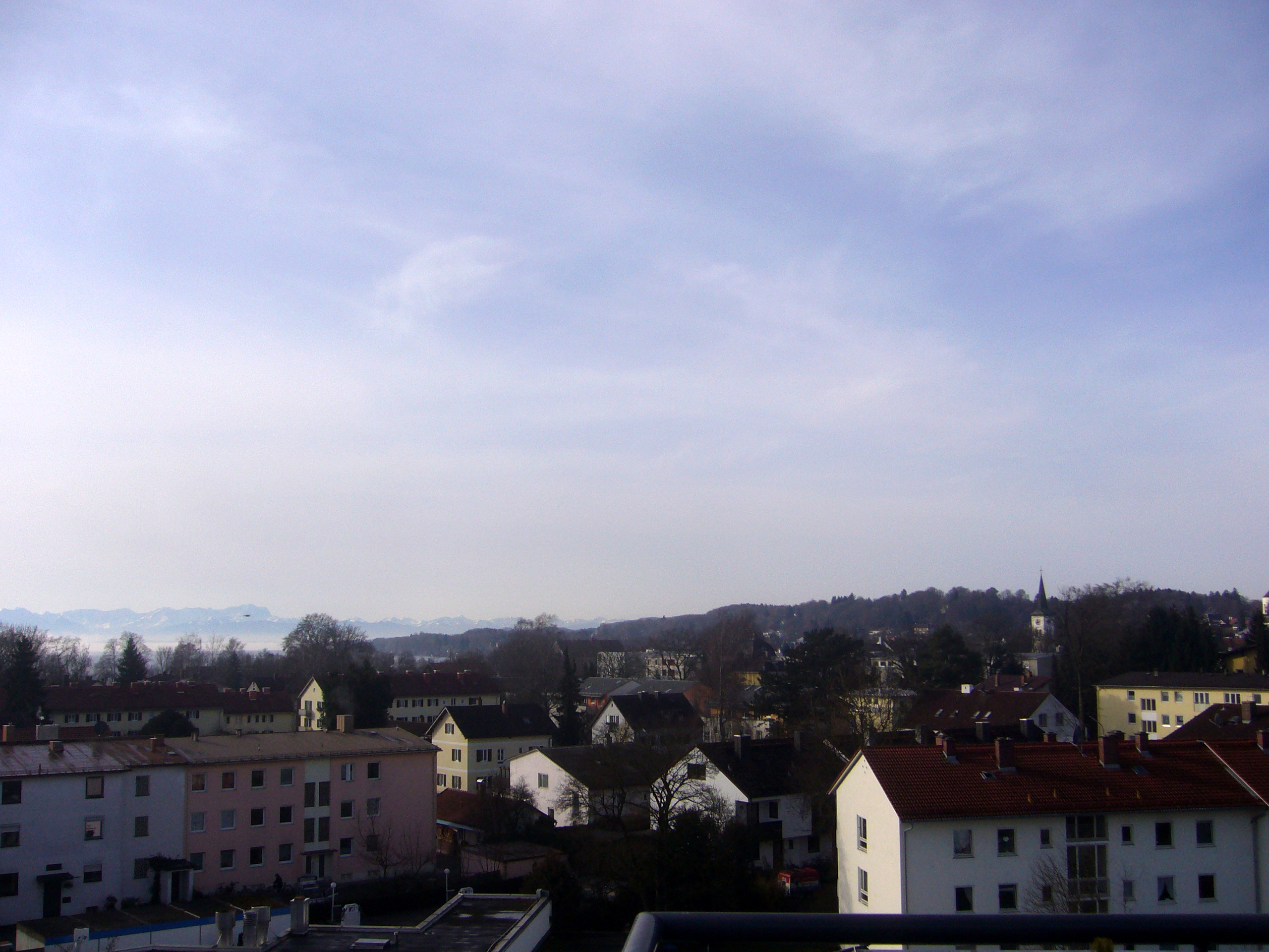 Blick vom Dach des Hotel Vier Jahreszeiten über Teile Starnbergs und am Horizont die Alpenkulisse.