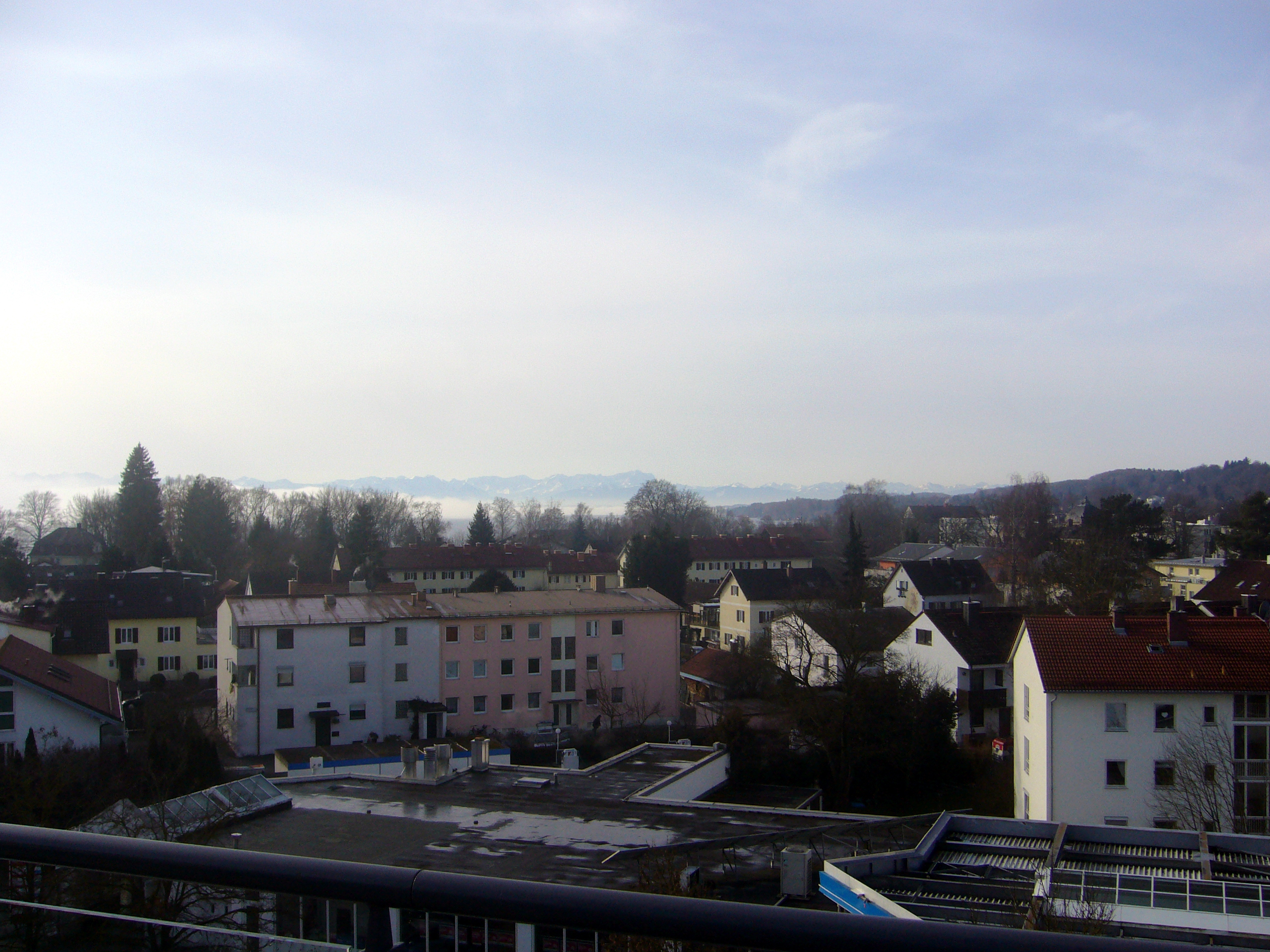 Blick vom Dach des Hotel Vier Jahreszeiten über Teile Starnbergs und am Horizont die Alpenkulisse.