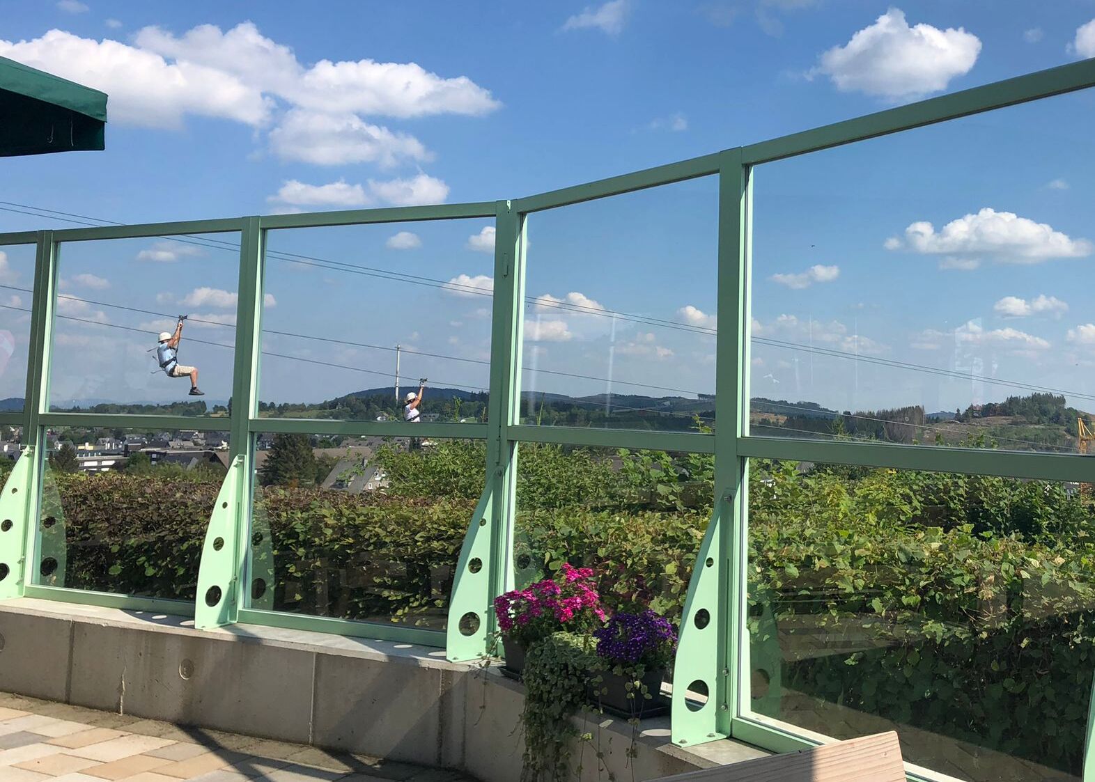 Schanzengastronomie unter der St-Georg-Schanze mit Blick auf die Sky-Fly ZIP-Line.