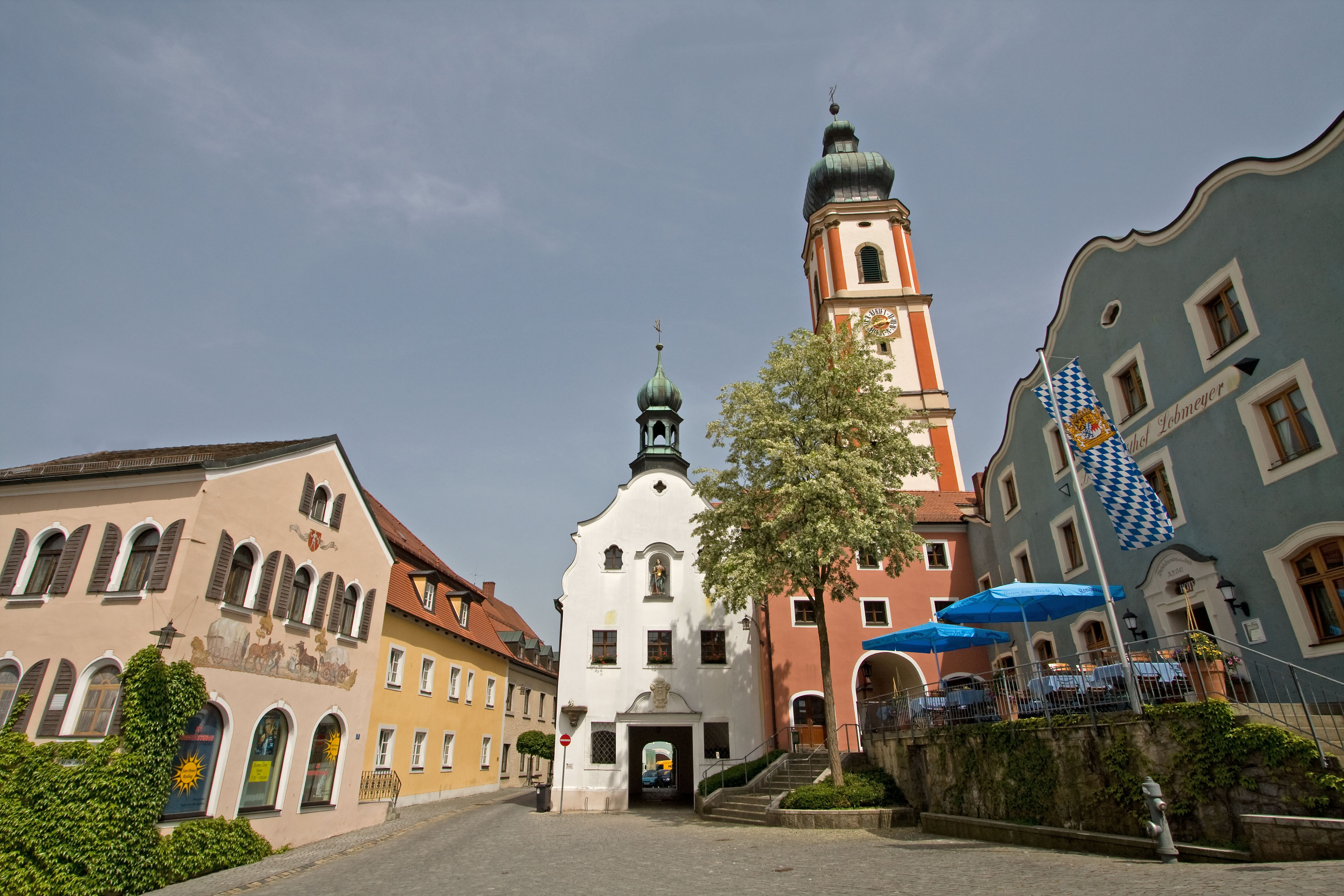 Hier mit dem Alten Rathaus von Roding aus der Mitte des 14. Jahrhunderts und der Stadtpfarrkirche St. Pankratius.