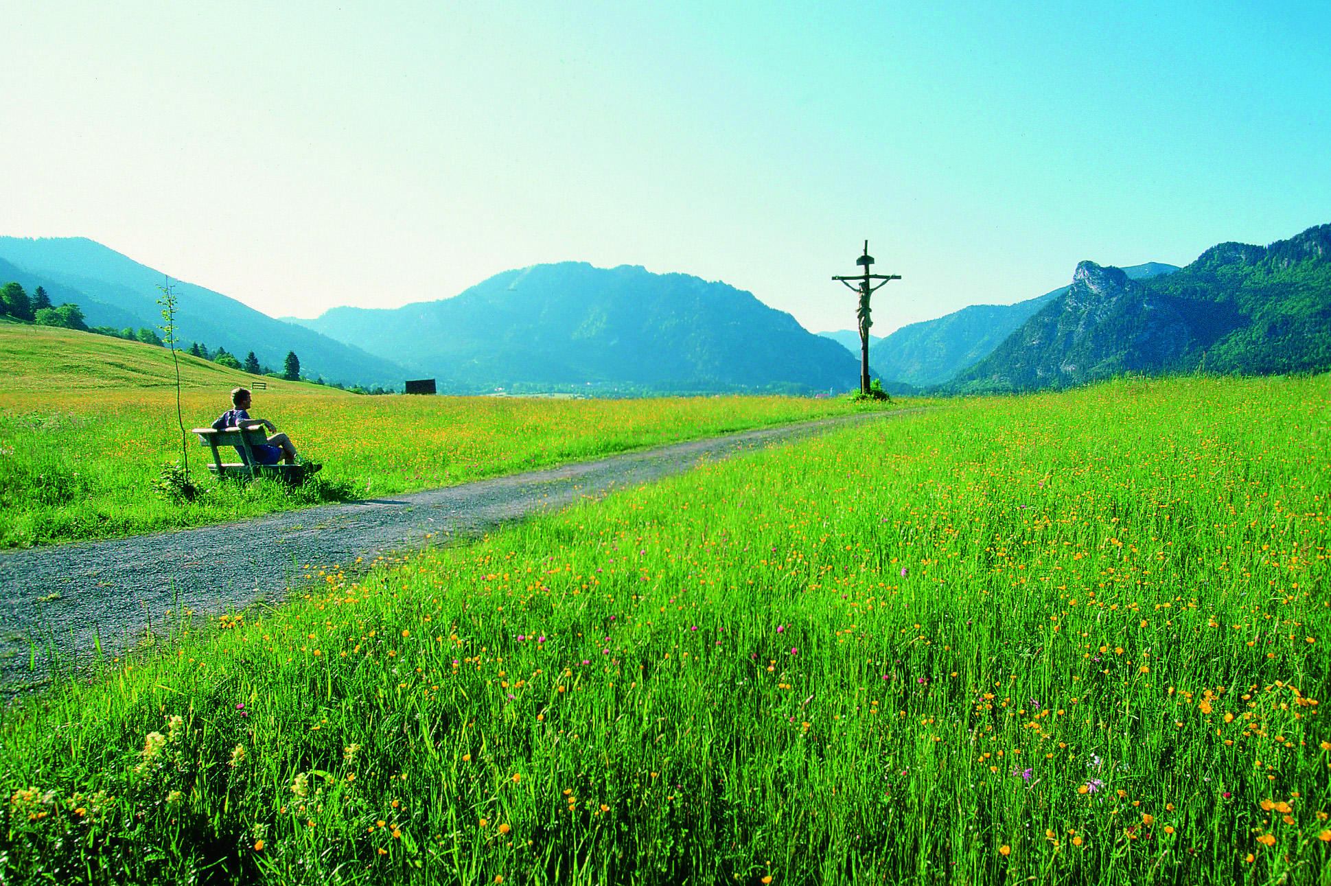 Kruzifix am Meditationsweg mit Blick auf die Berge.