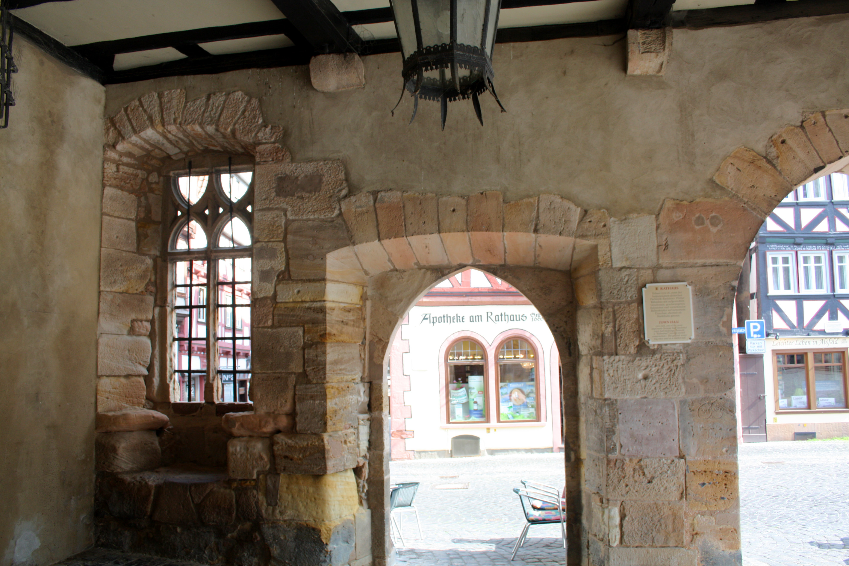 Die offene Erdgeschoßhalle als Steinbasis vom Rathaus Alsfeld.