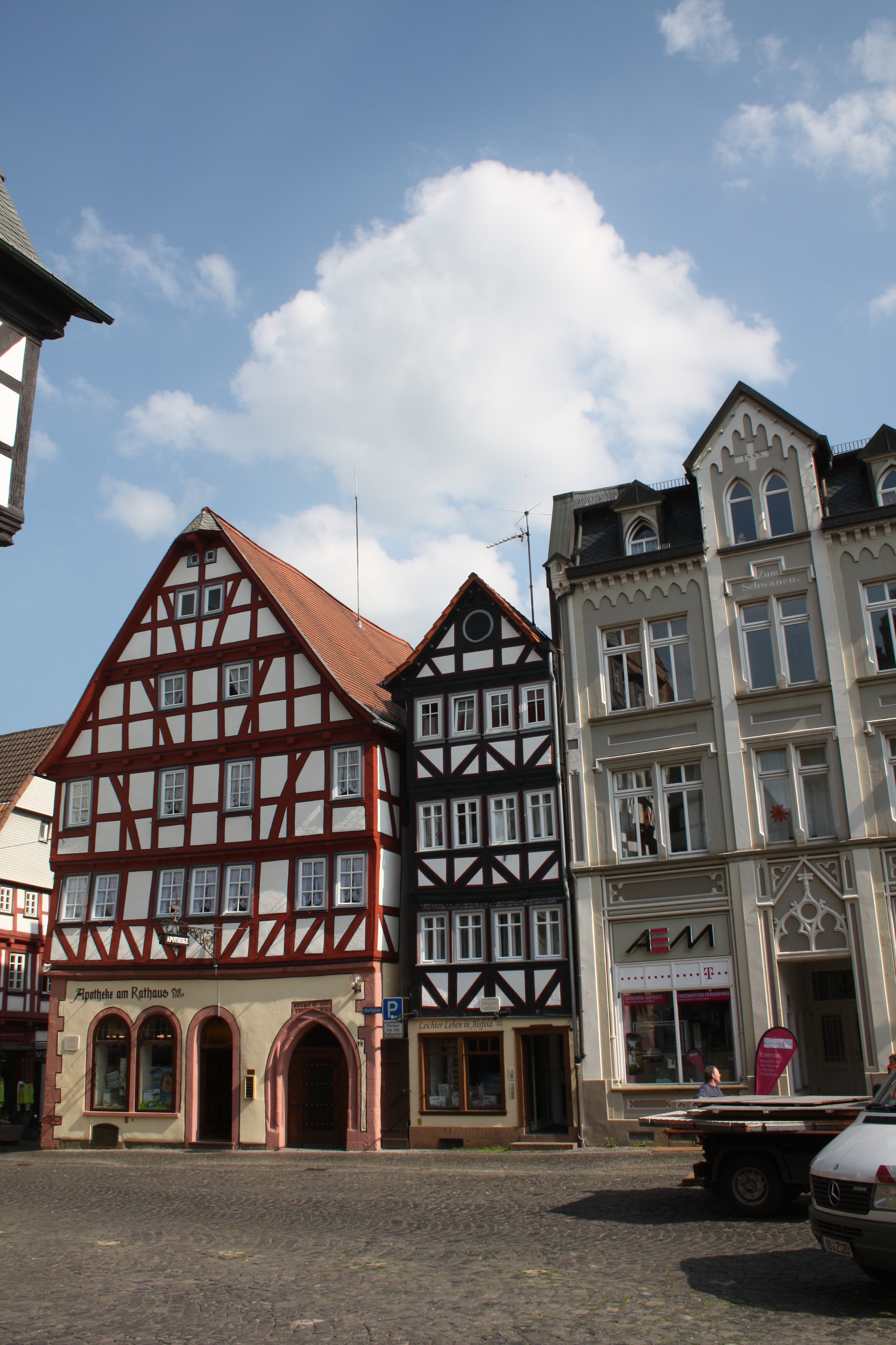 Neogotisches Haus (rechts im Bild), Apotheke(links im Bild) und das viergeschossiges Giebelfachwerkhaus (Mittig im Bild).