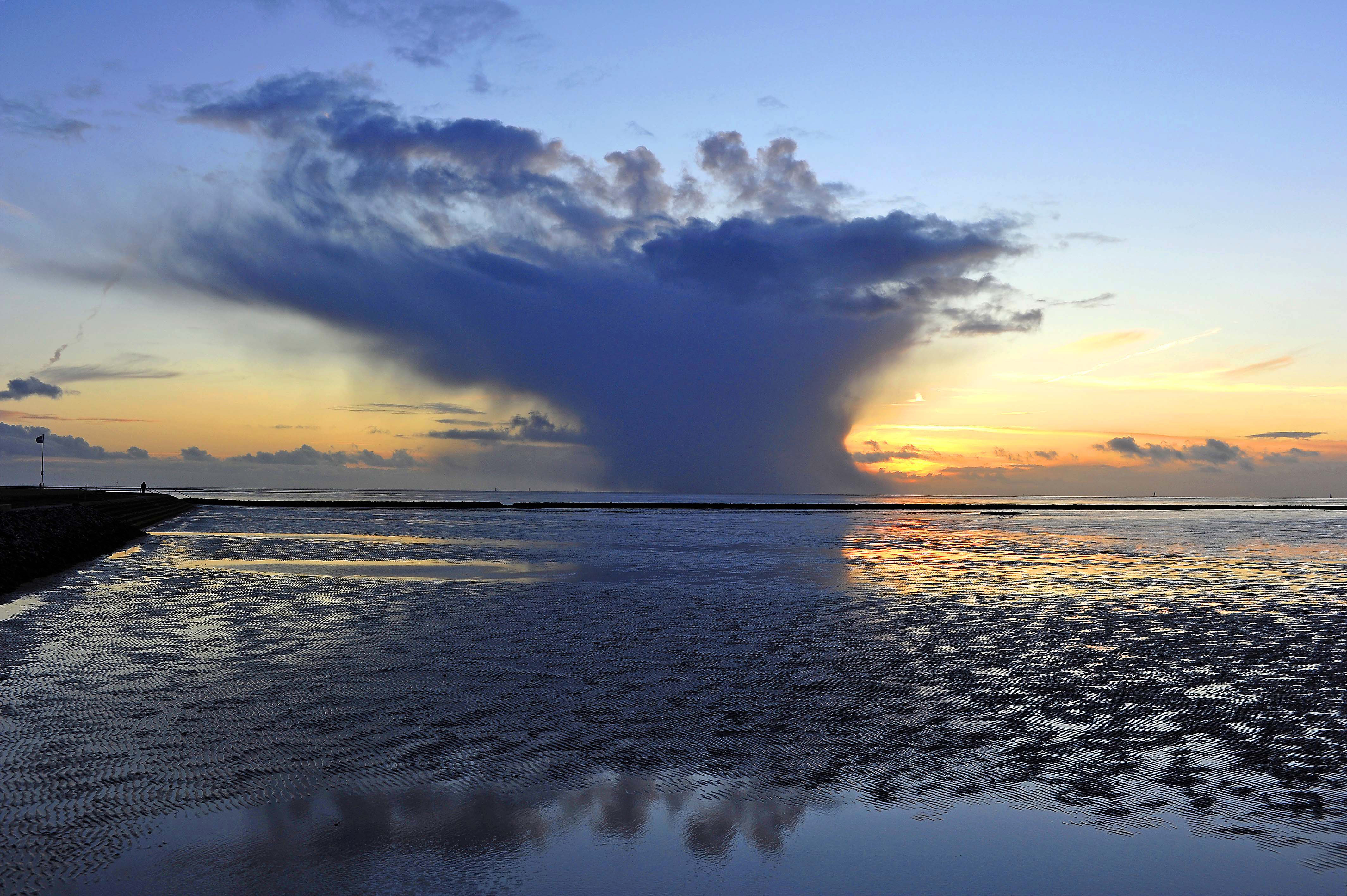 Regenwolke über Watt vor Wurster Nordseeküste.