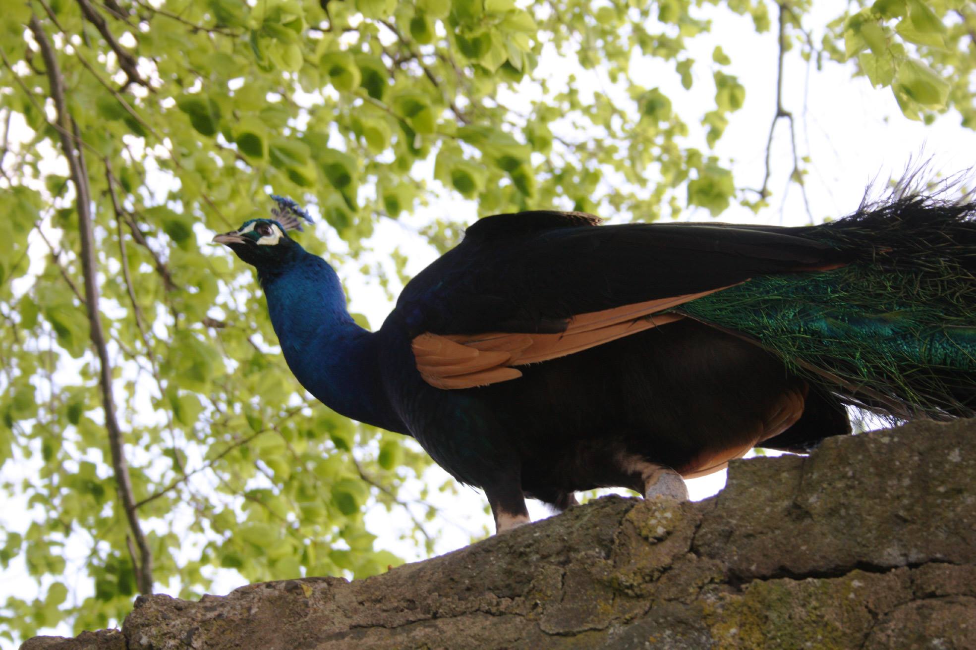 Wilde Pfauen laufen teilweise direkt beim Biergarten der Burgpost.