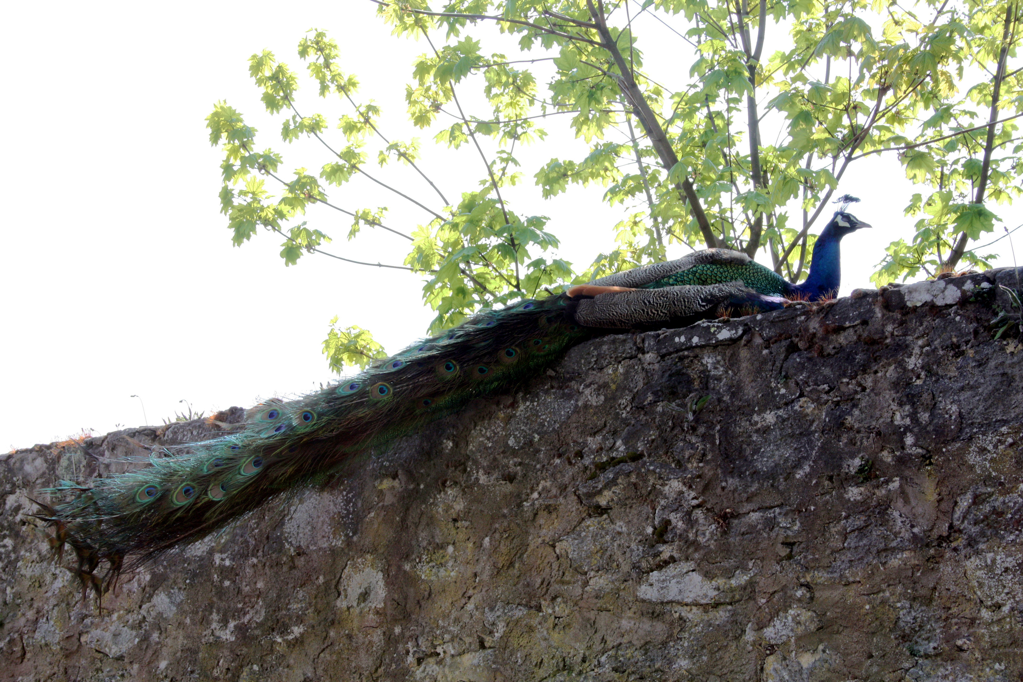 Wilde Pfauen laufen teilweise direkt beim Biergarten der Burgpost.
