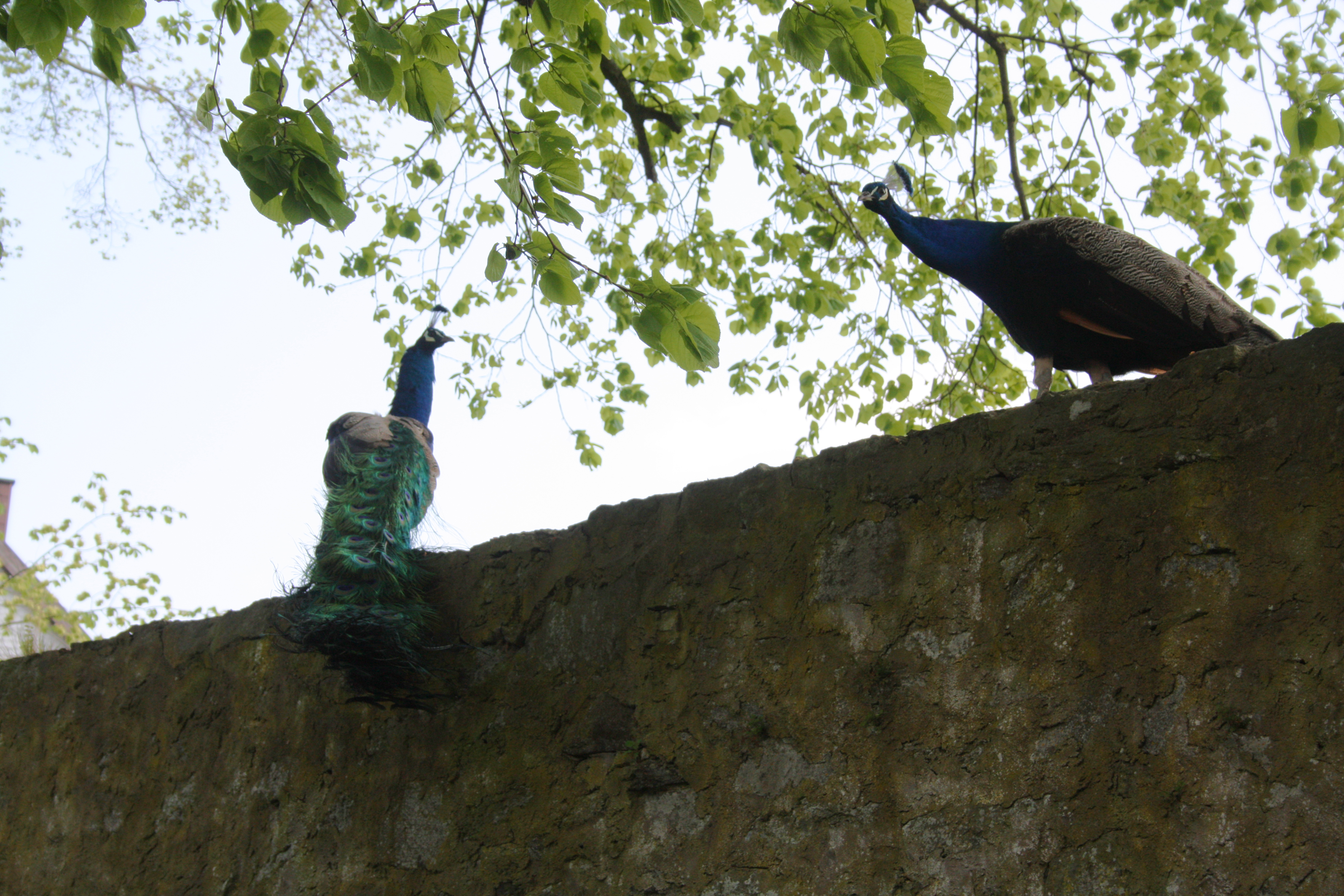 Wilde Pfauen laufen teilweise direkt beim Biergarten der Burgpost.