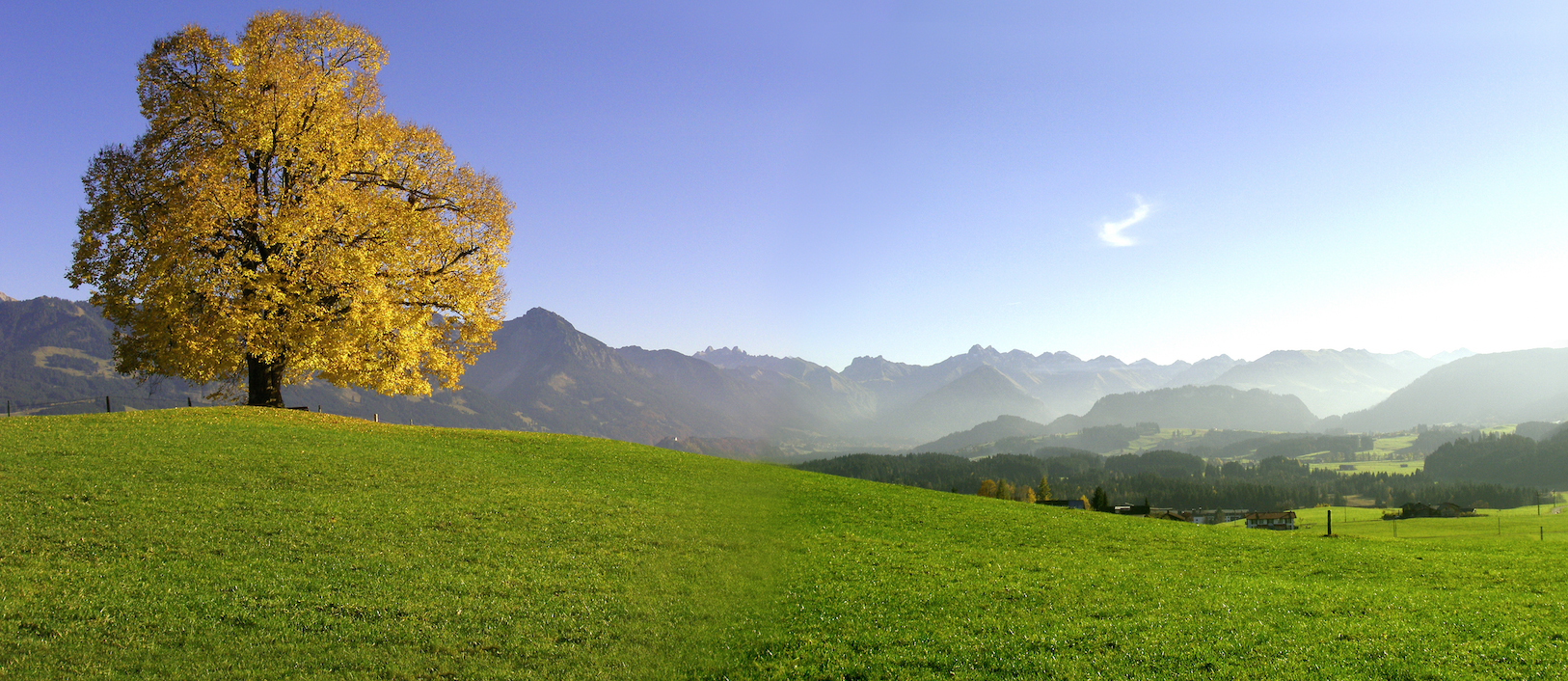 Oben angekommen wartet eine Bank am Fuße der alten Linde. Von hier aus kann man bei guter Witterung nahezu einen 360° Grad Panoramablick auf die Hörnerkette, den Allgäuer Hauptkamm, Sonthofen und den Grünten genießen.