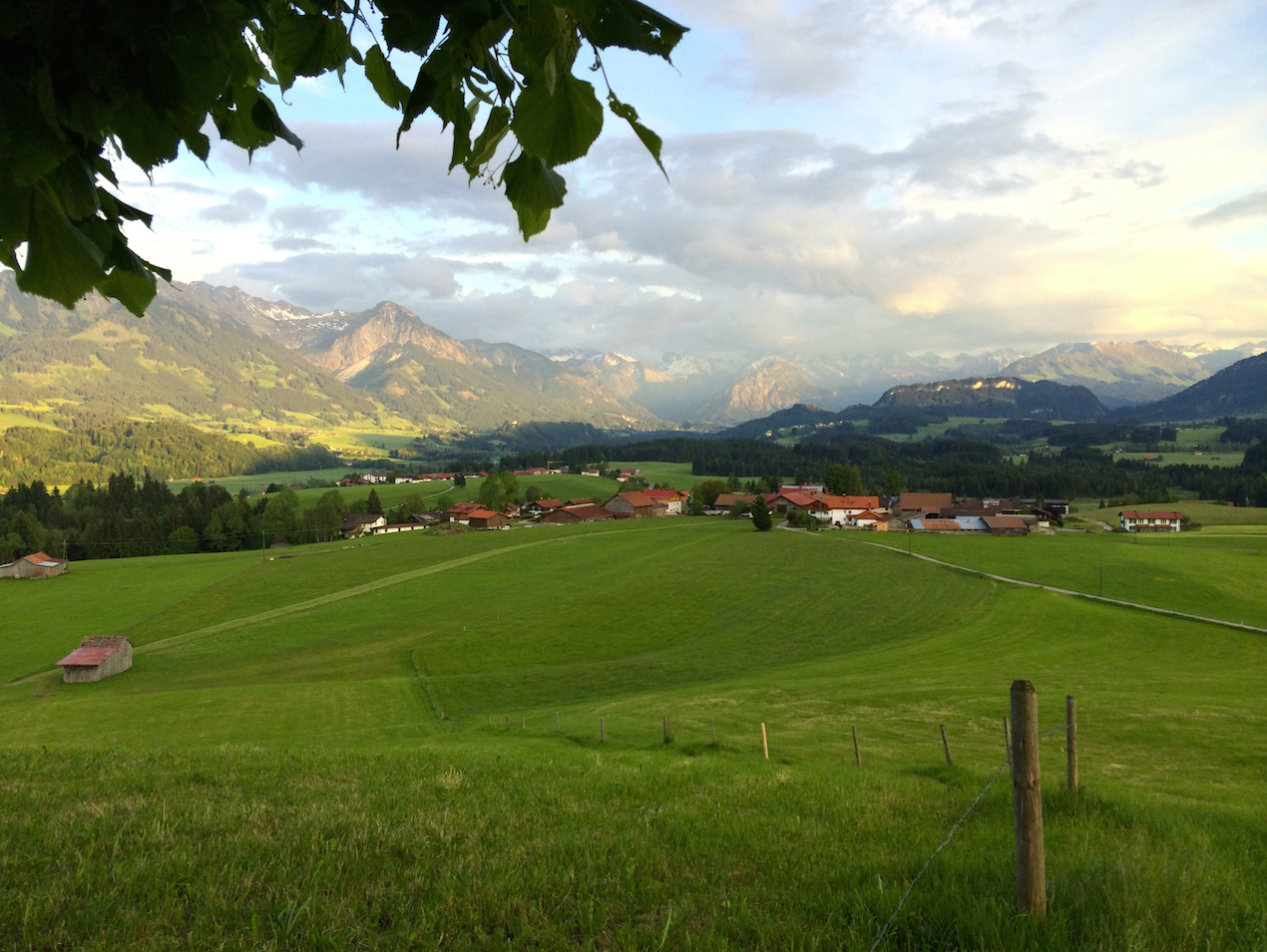 Oben angekommen wartet eine Bank am Fuße der alten Linde. Von hier aus kann man bei guter Witterung nahezu einen 360° Grad Panoramablick auf die Hörnerkette, den Allgäuer Hauptkamm, Sonthofen und den Grünten genießen.
