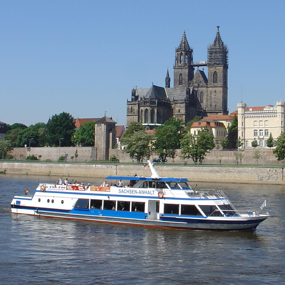 Magdeburger Dom und die Weiße Flotte auf der Elbe.
