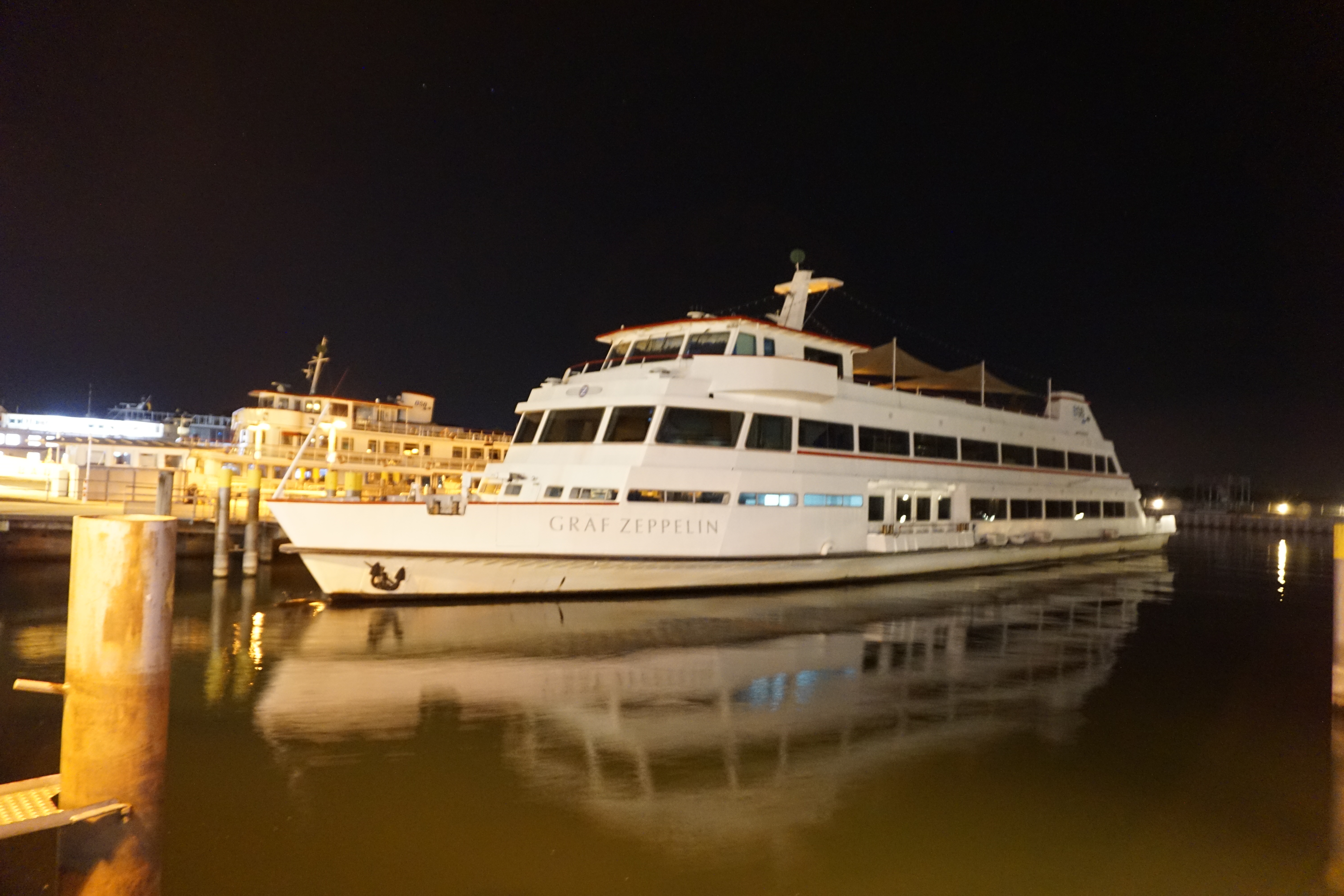 Die MS Graf Zeppelin am Schiffsanleger / Hafen von Friedrichshafen bei Nacht.