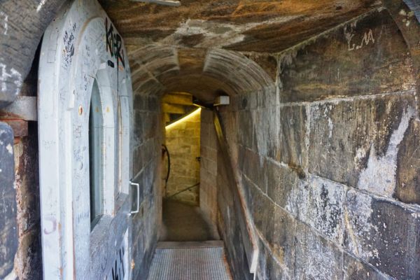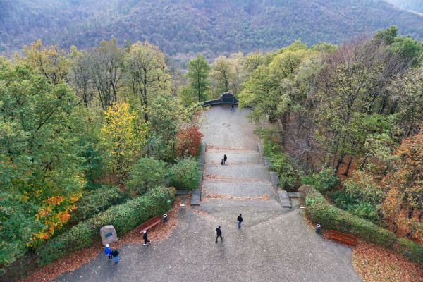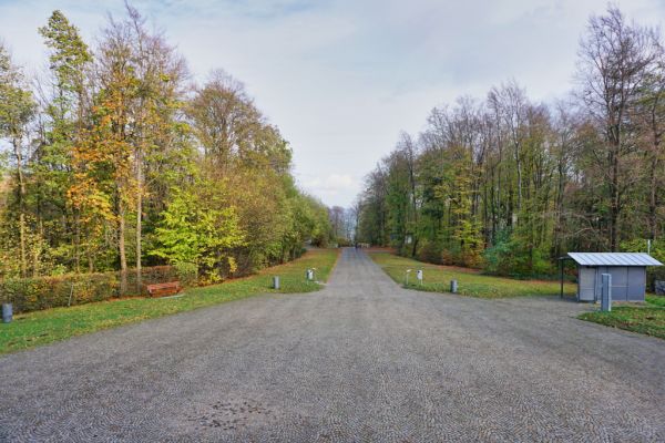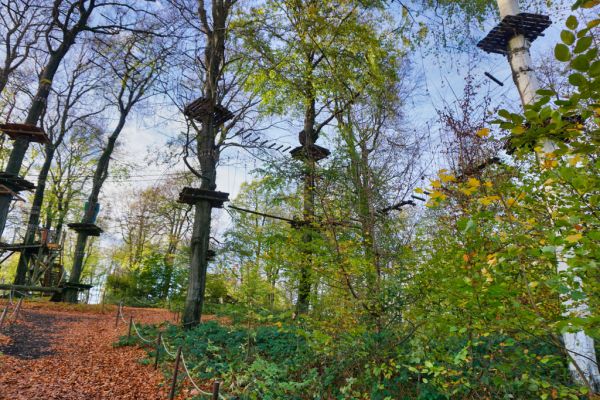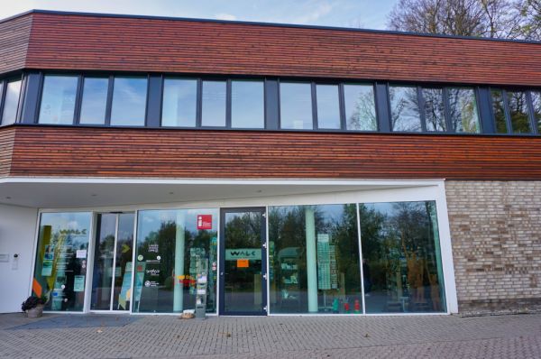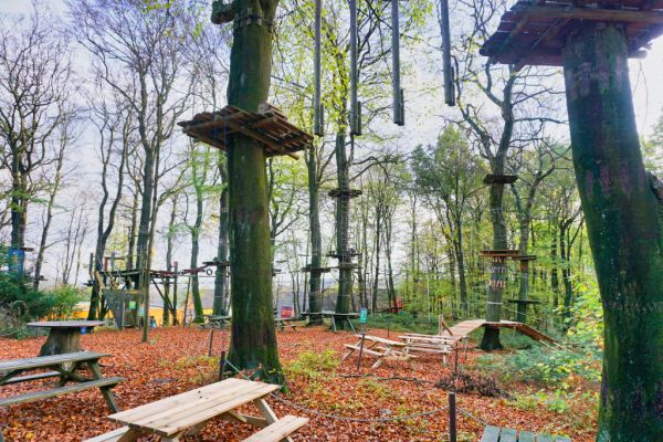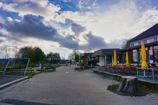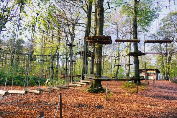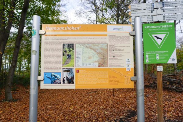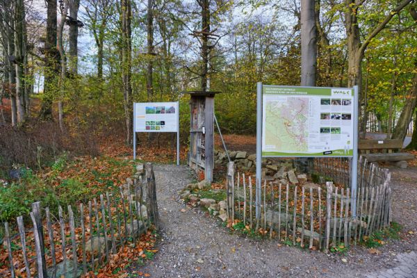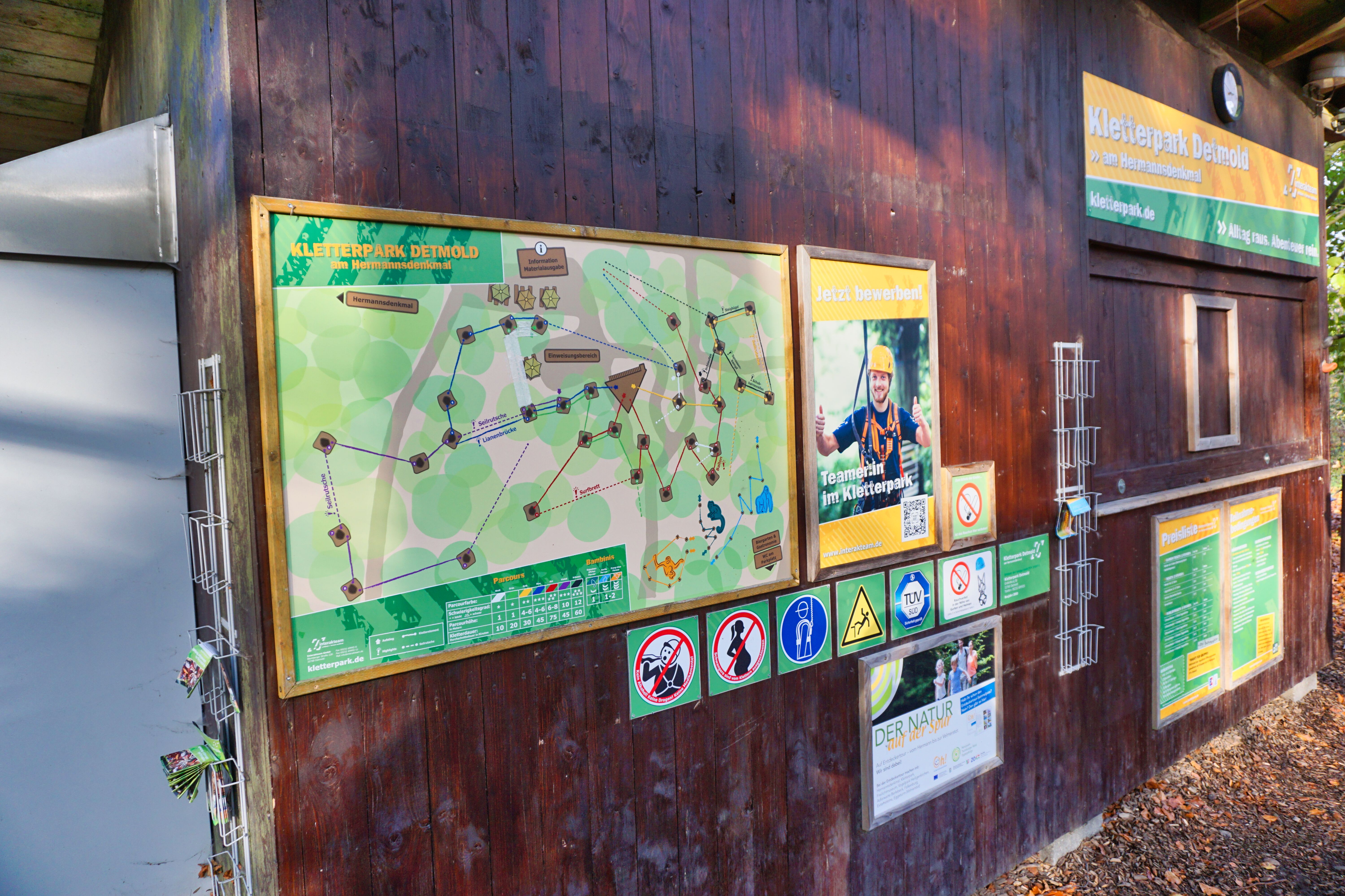 Infotafel und Ticketstand am Kletterpark Hermannsdenkmal, Detmold.