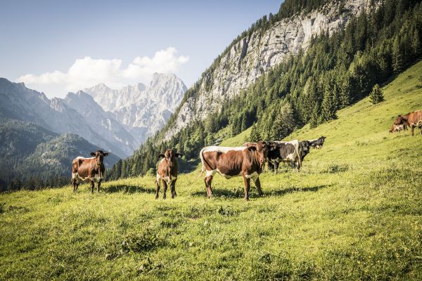 Bildbeschreibung: Rund um die Kammerlingalm oberhalb von Berchtesgaden/Oberbayern haben Kühe viel Raum zum Weiden – Wanderer sollten den Tieren mit Respekt begegnen.