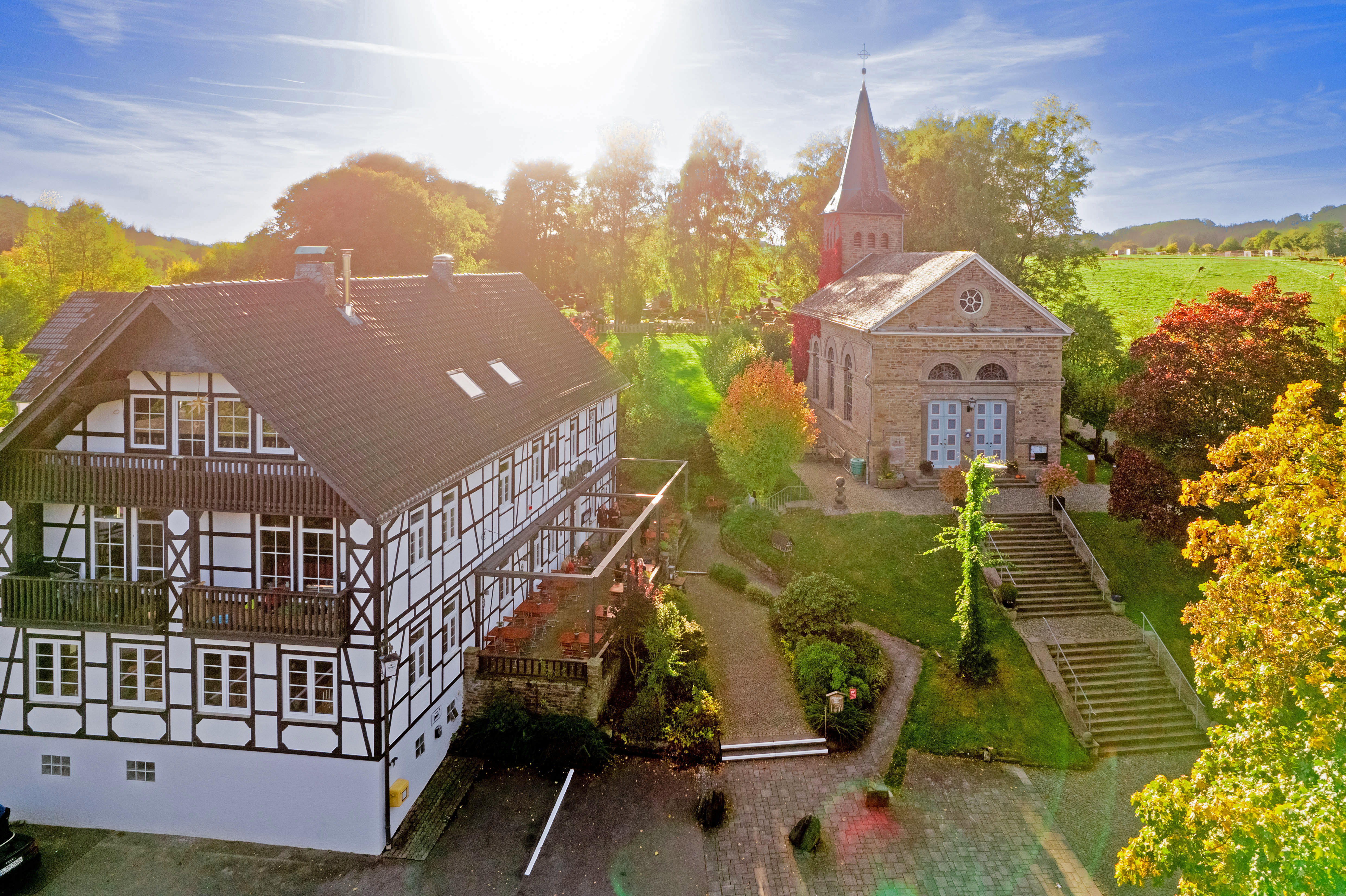 Titelbild: In Kürten-Delling warten historische Gebäude auf Besucher - wie zum Beispiel die kleine pittoreske Kirche aus dem Jahr 1834. ©djd/Das Bergische/Holger Hage