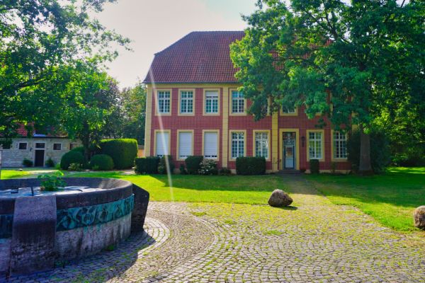 Burggebäude und Brunnen auf dem Burgberg in Stromberg, Oelde
