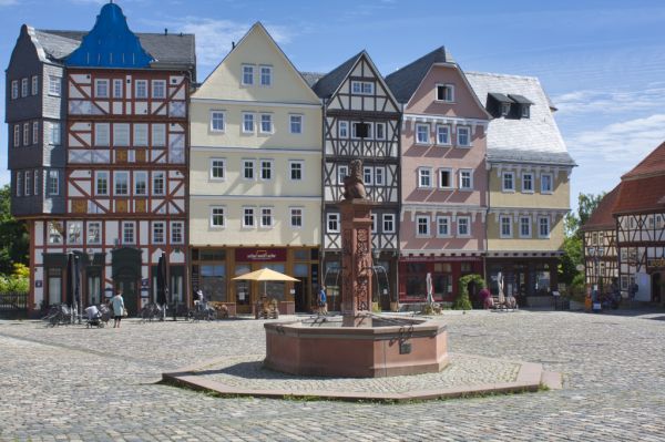Marktplatz mit Brunnen im Freilichtmuseum Hessenpark in Neu-Anspach
