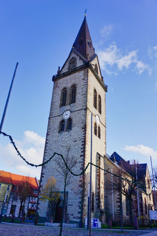 Die St. Johannes Baptist Kirche ist eine katholische Pfarrkirche in der Warburger Neustadt. Sie wurde im 13. Jahrhundert erbaut und ihr Grundriss formt ein Kreuz. Der über 80 Meter hohe Kirchturm ist von Weitem ersichtlich. Er ist Glockenturm, Wachturm und Feuerwehrturm und besitzt einen Umgang und eine kupferbedeckte Spitze.