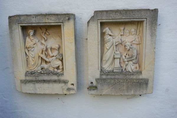 zwei Reliefs aus Sandstein an der Außenmauer der Kreuzkirche in Oelde Stromberg