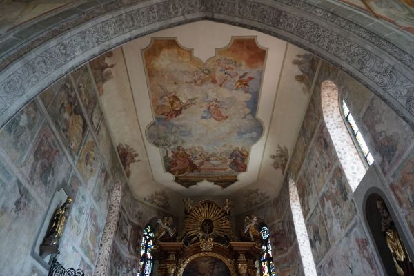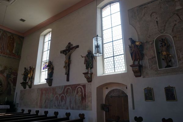 Die Kirchenwände sind aufwendig mit zwei Bilderzyklen bemalt, im Langschiff aus dem Neuen und im Chor aus dem Alten Testament. Sie sollten den Pilgern, die nicht lesen konnten, als Lehre dienen und sind eine seltene, noch erhaltene Raumausmalung der Gotik. Einzelne Bilder im Schiff und der gesamte Chor wurden in den 1930er Jahren wieder freigelegt, bemalt wurde aber der gesamte Innenraum.